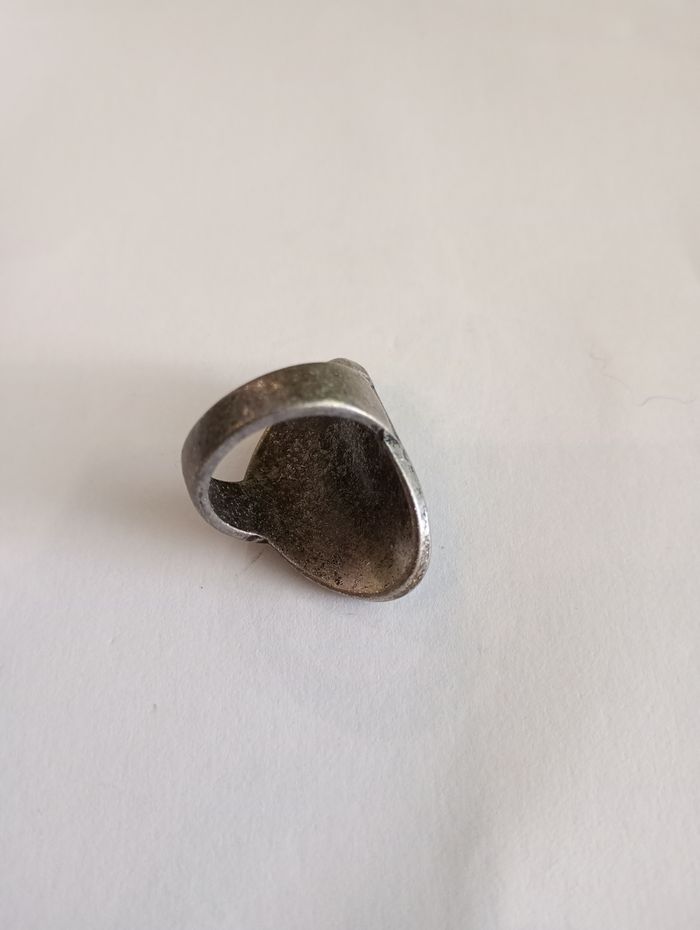 Bague avec pierre bleue ovale sertie de strass bleus clairs. Effet argent. 17,3 mm. Très bon état