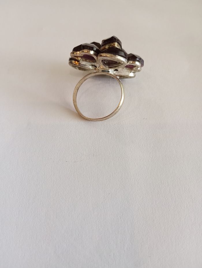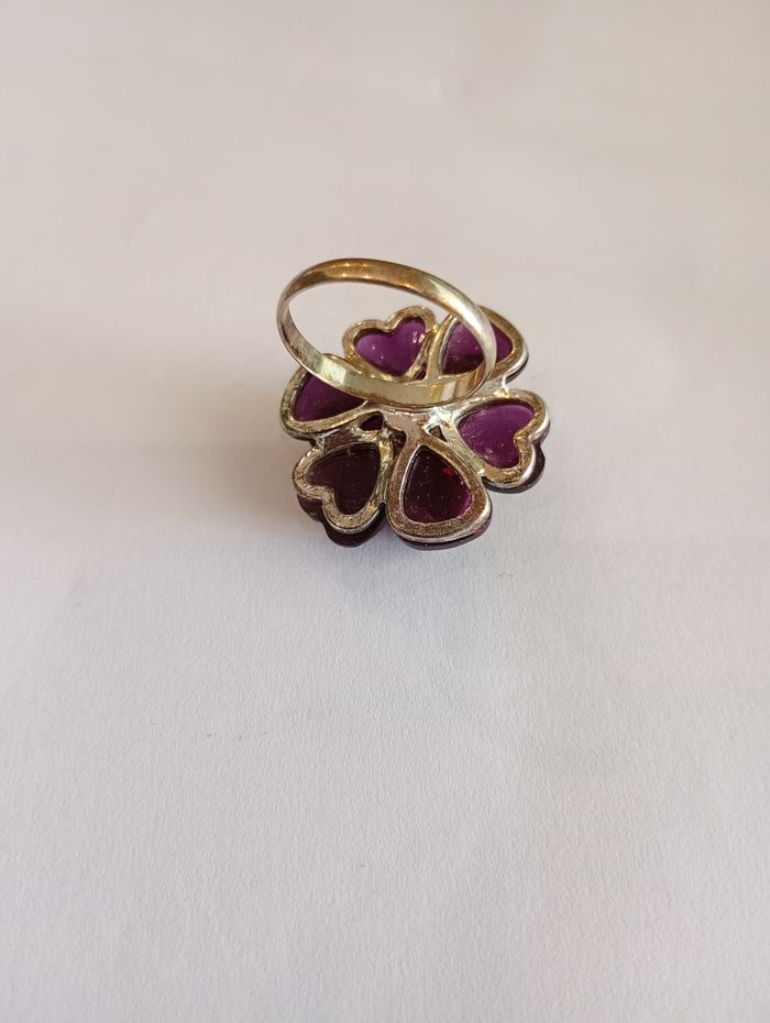 Bague avec fleur (3 cm de diamètre) en pierres violettes avec strass rose clair. Elle est en très bon état mais il manque un tout petit strass rose. 19mm