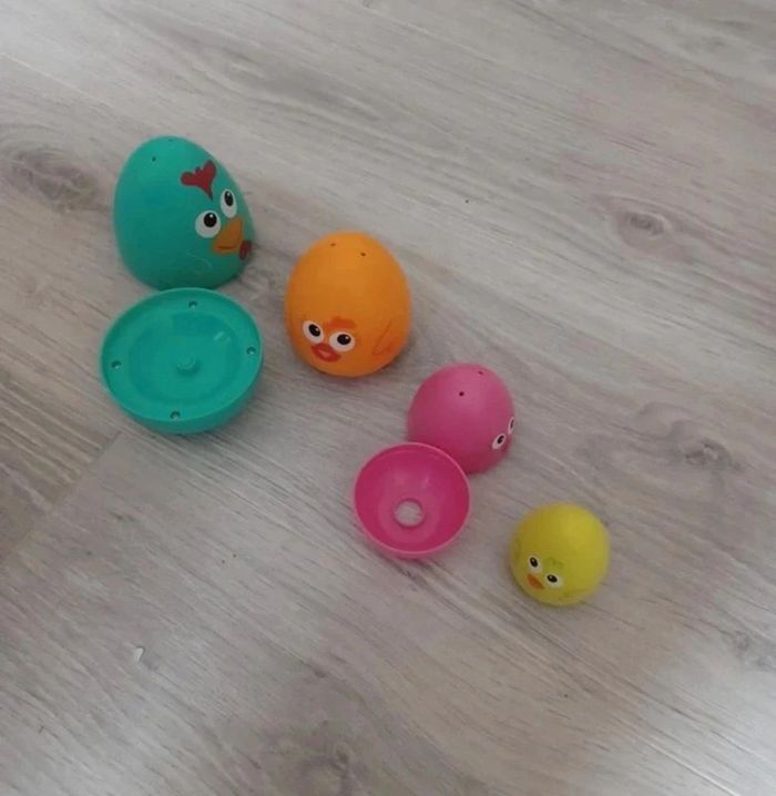 4 oeufs à cacher. Le papa œuf encourage la recherche des autres et une fois la famille réunie chante une chanson. #gastiejouet