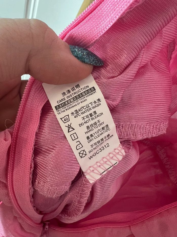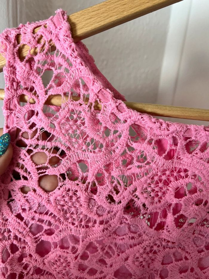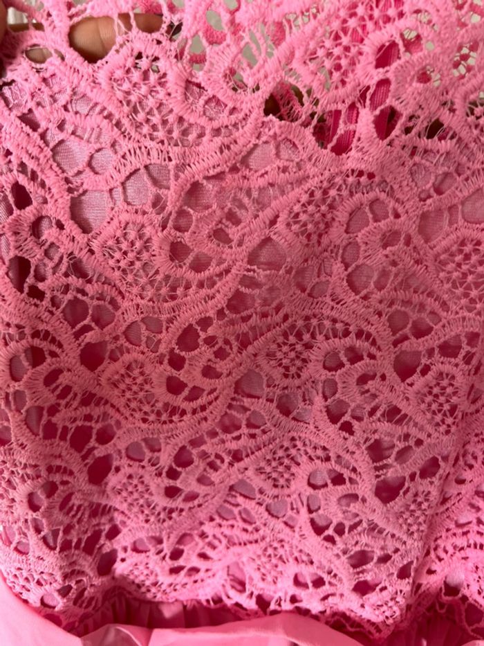 Je vend cette robe type cérémonie / occasion rose a tule. Haut type dentelle, resserrer à la taille, fermeture éclair dans le dos. Doubler au niveau du bas. Pas d’étiquette de taille mais correspond à une taille 12 ans (voir avec combinaison noir). Très bon état, jamais portée.