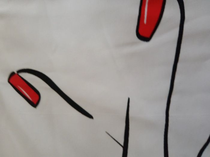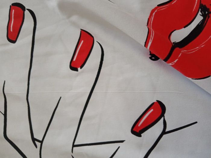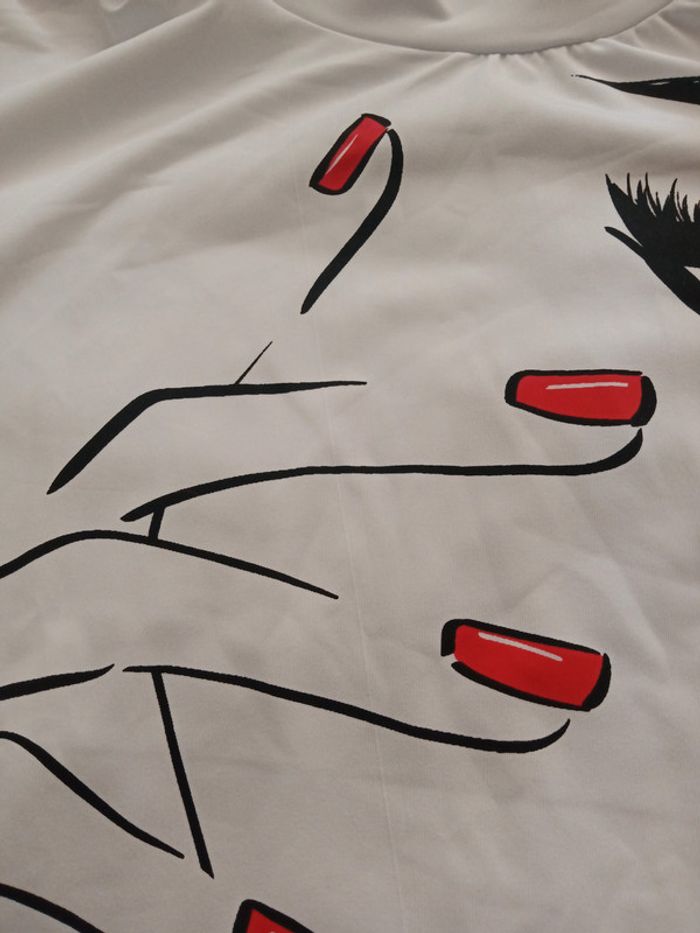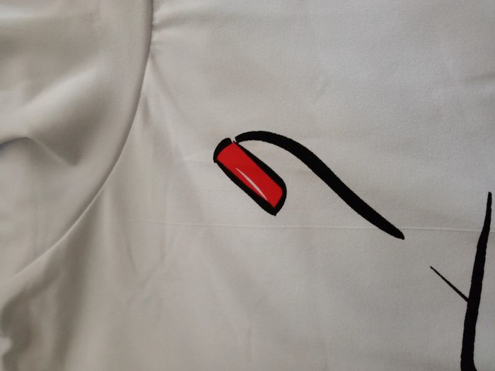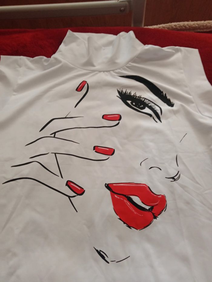 Tee shirt à col rond imprimé, manches courtes. Taille L, en 95% polyester et 5% elastane. Très bon état juste un petit défaut en haut jusqu'au milieu (comme une maille tirée). Voir photo.