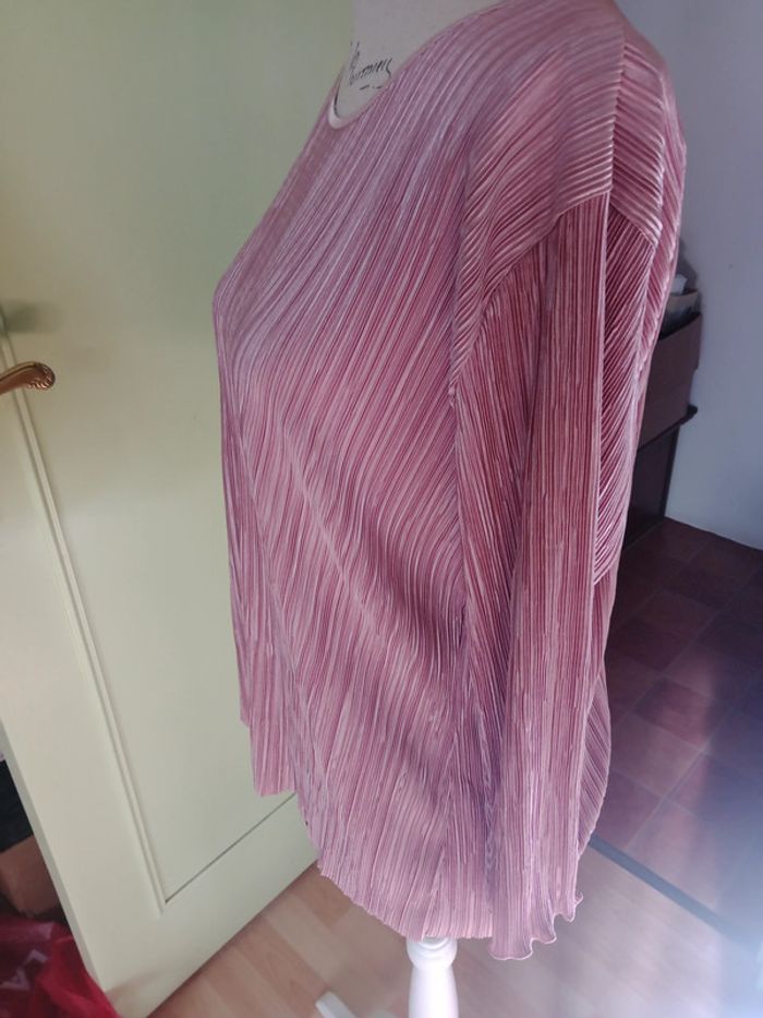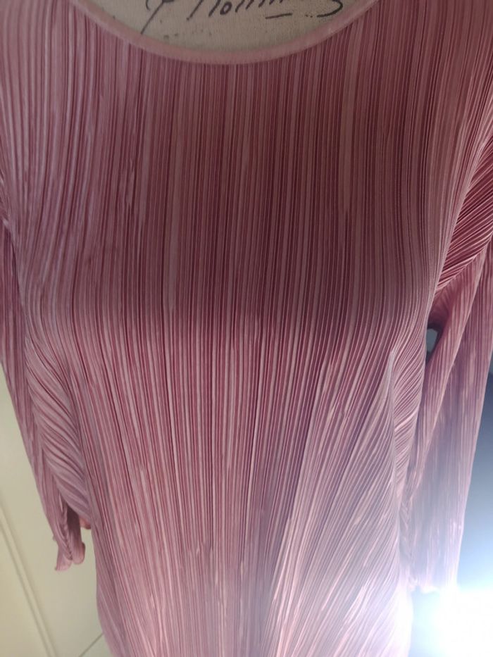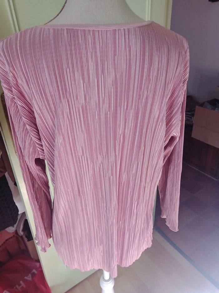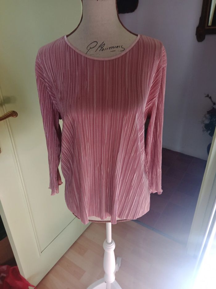 Haut manches 3/4, rose brillant en mousseline gaufre, taille 40. Bon état général.