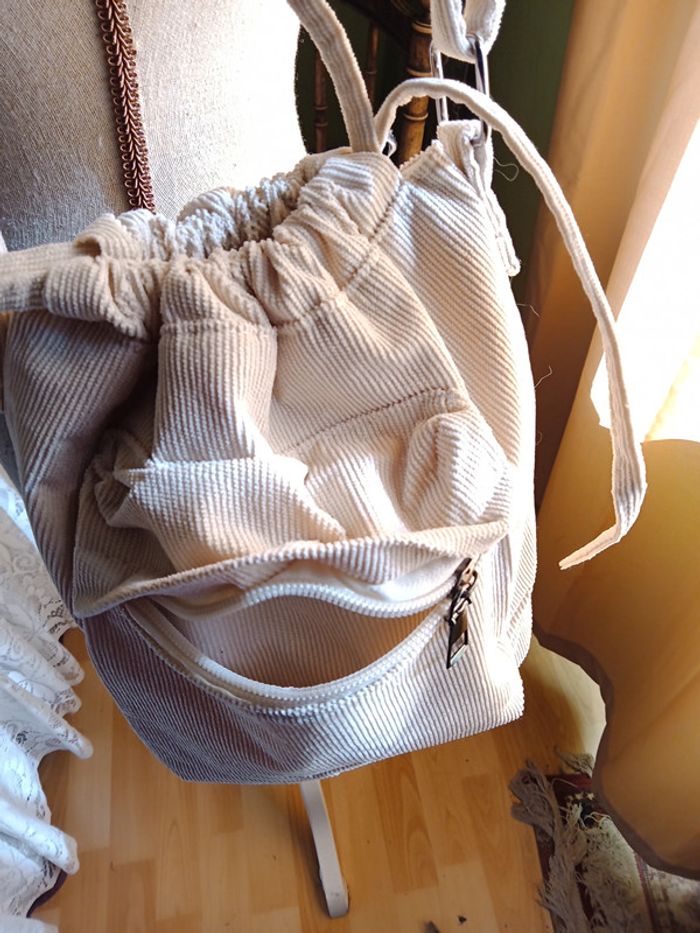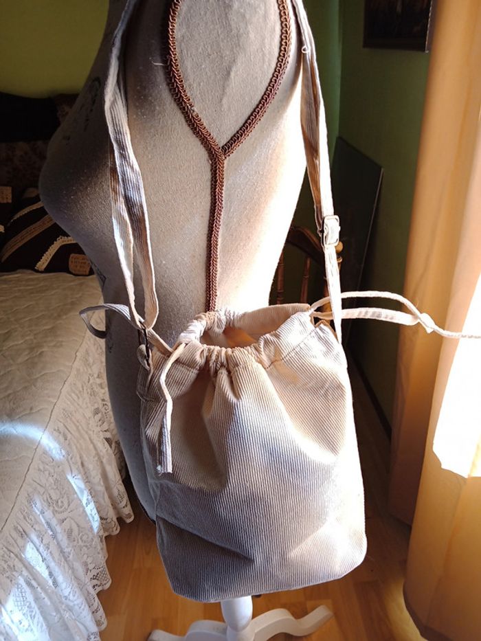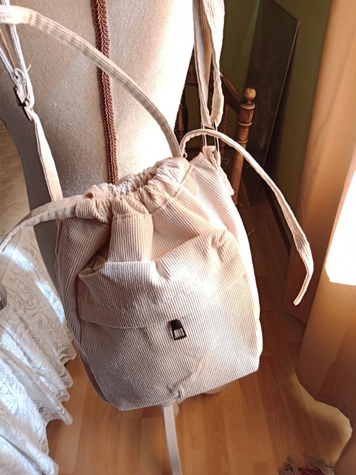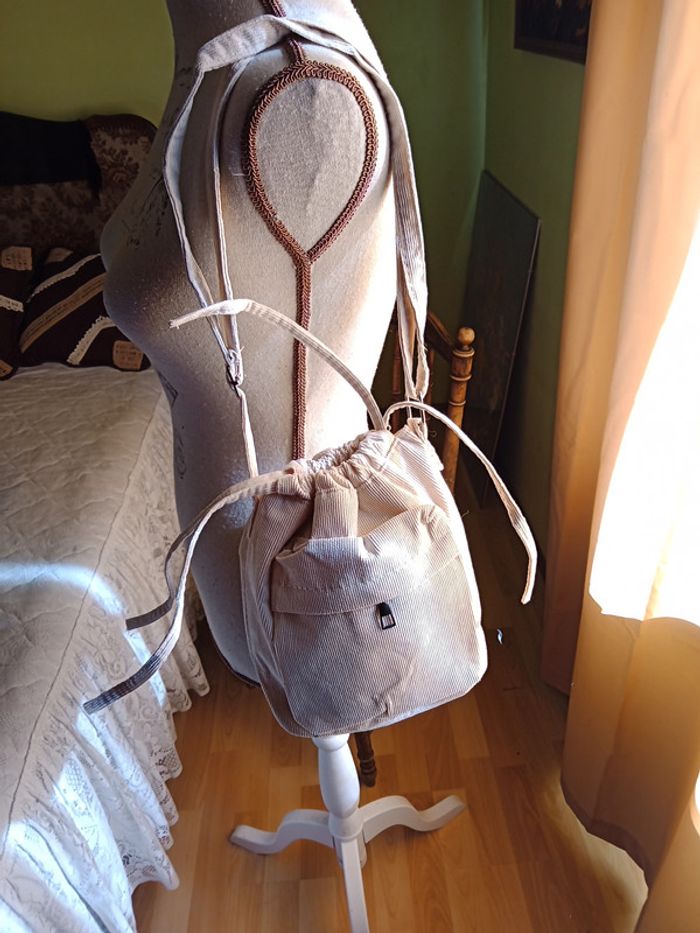 Sac à main bandoulière, fermeture cordon de serrage. 2 poches 1 intérieure et 1 extérieure. Couleur blanc cassé. Dimensions 24 X 25 cm. En parfait état.