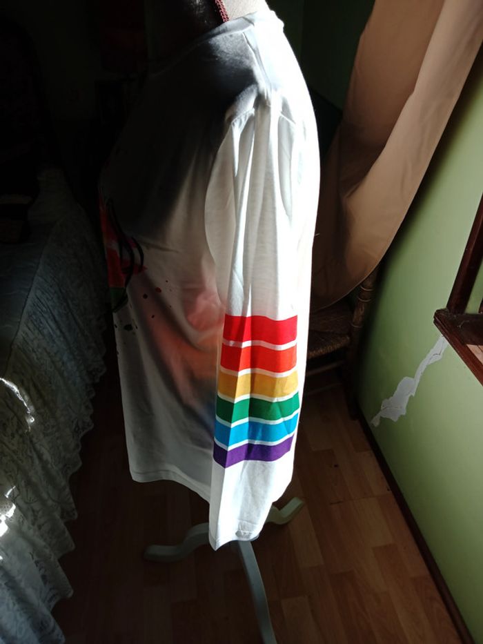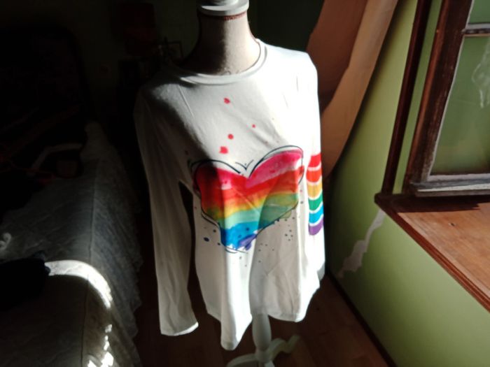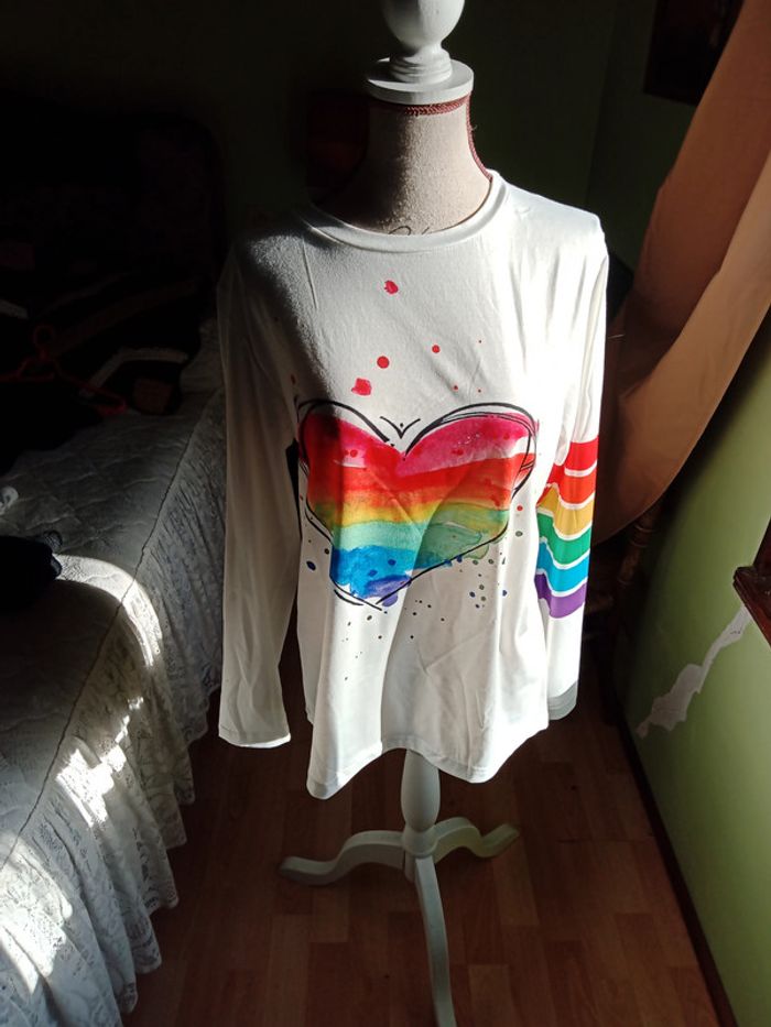 Tee shirt manches longues, taille L. Motif coeur, en 100% polyester. Très bon état général mis qu'une fois.