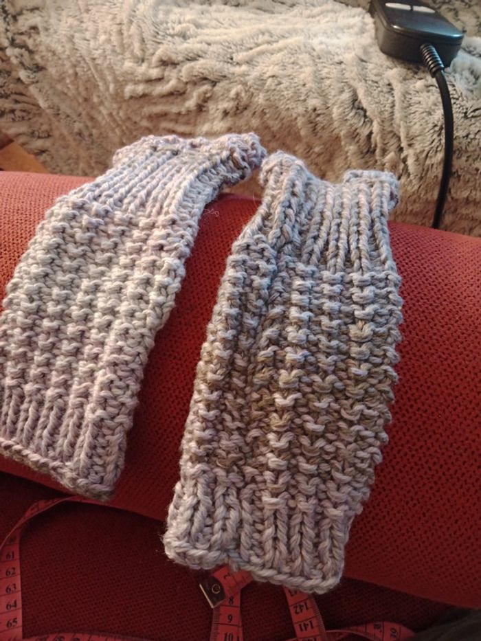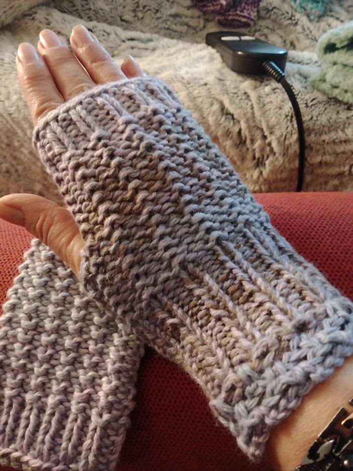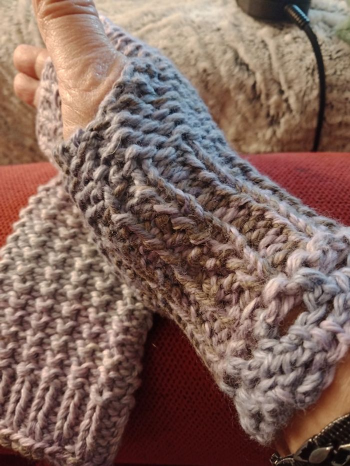 Mitaines tricotées main en laine multicolore mauve. Modèle inventé neuves jamais portées. Dimensions largeur 7 cm, longueur 18 cm.