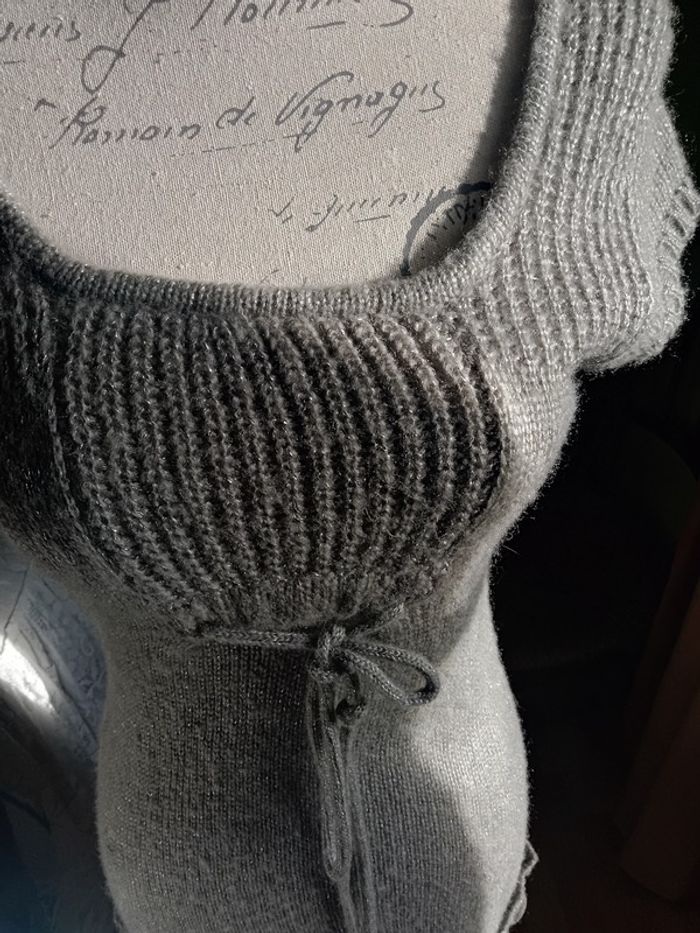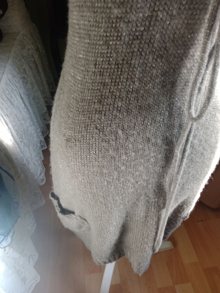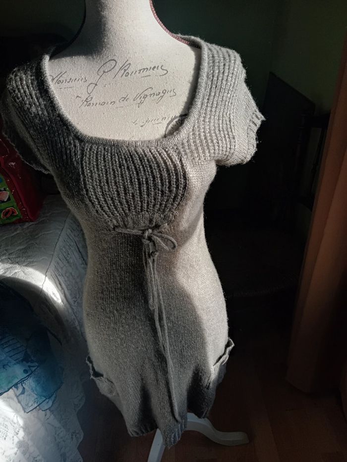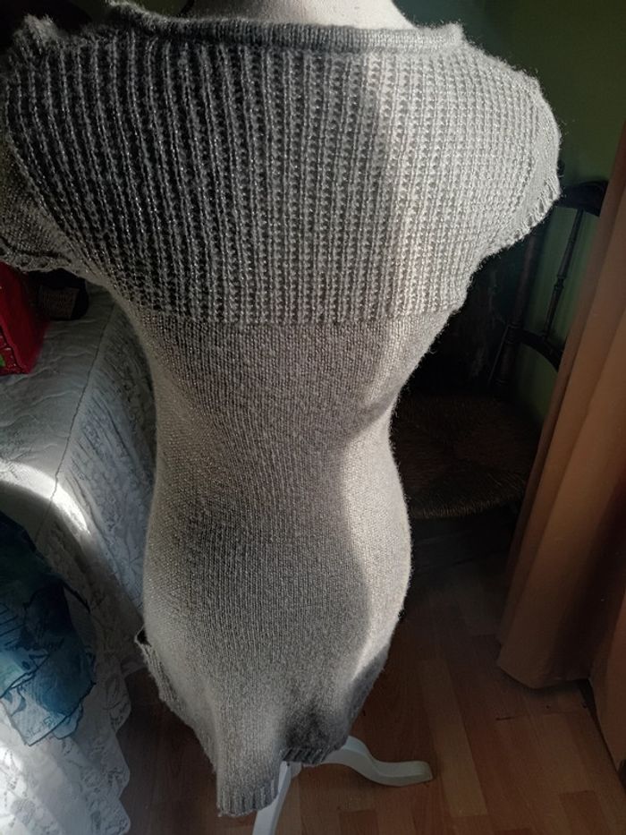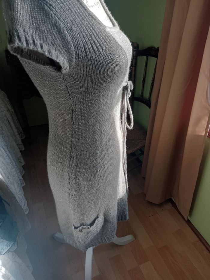 Robe ou tunique sans manche, taille 38. En 100% acrylique. En bon état général sauf quelques peluches par ci par là voir photos. Dimensions largeur 46 cm, et longueur 94 cm. 2 poches à pression . Couleur gris brillant.