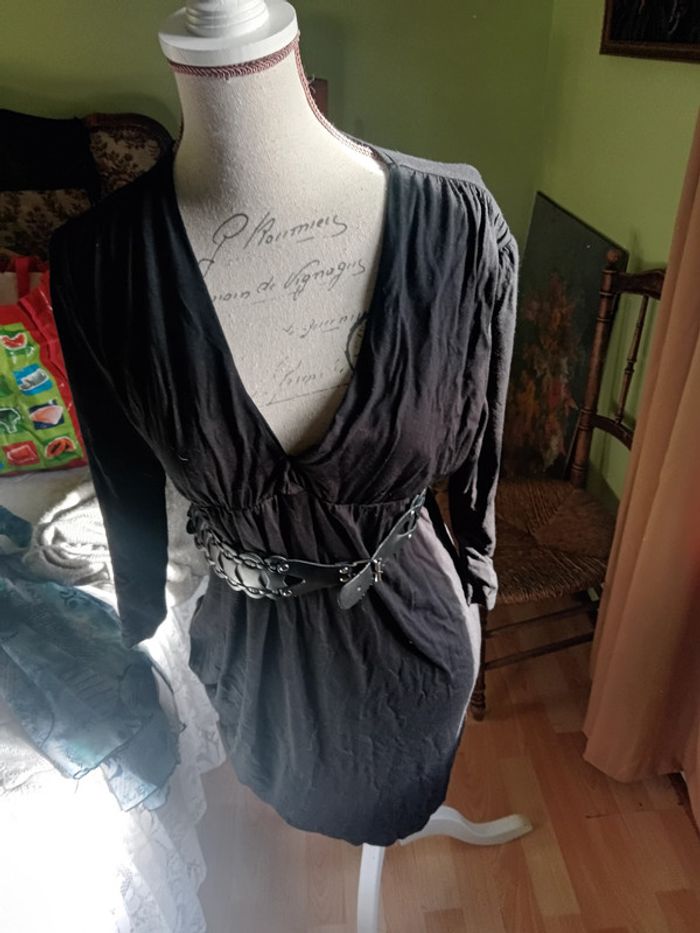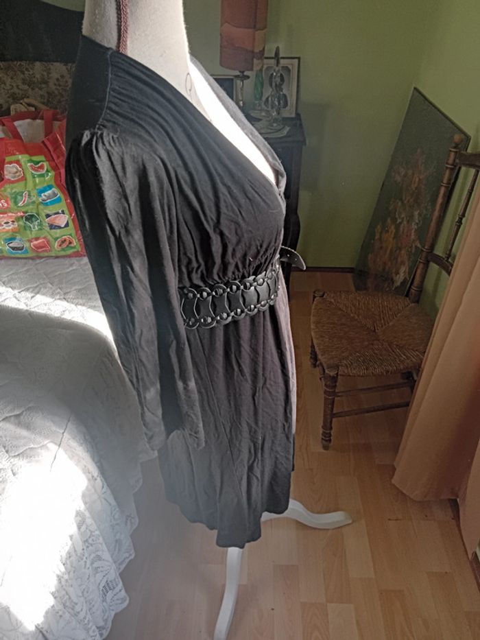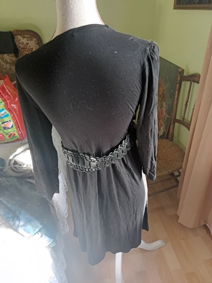 Robe manches 3/4 de chez Toumani, taille 38.noire en 95% viscose et 5% elastane. Robe avec ceinture. Dimensions Largeur épaules 46 cm et longueur 84 cm