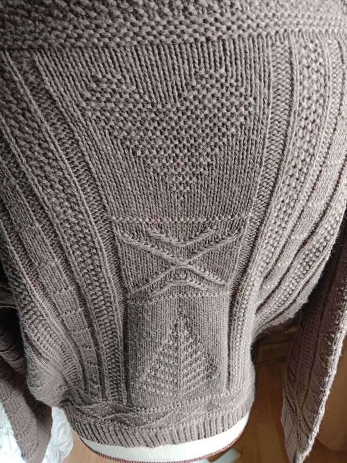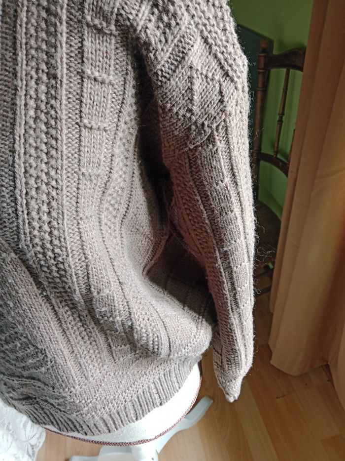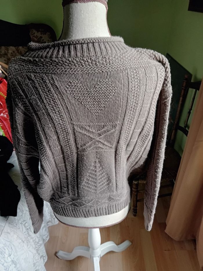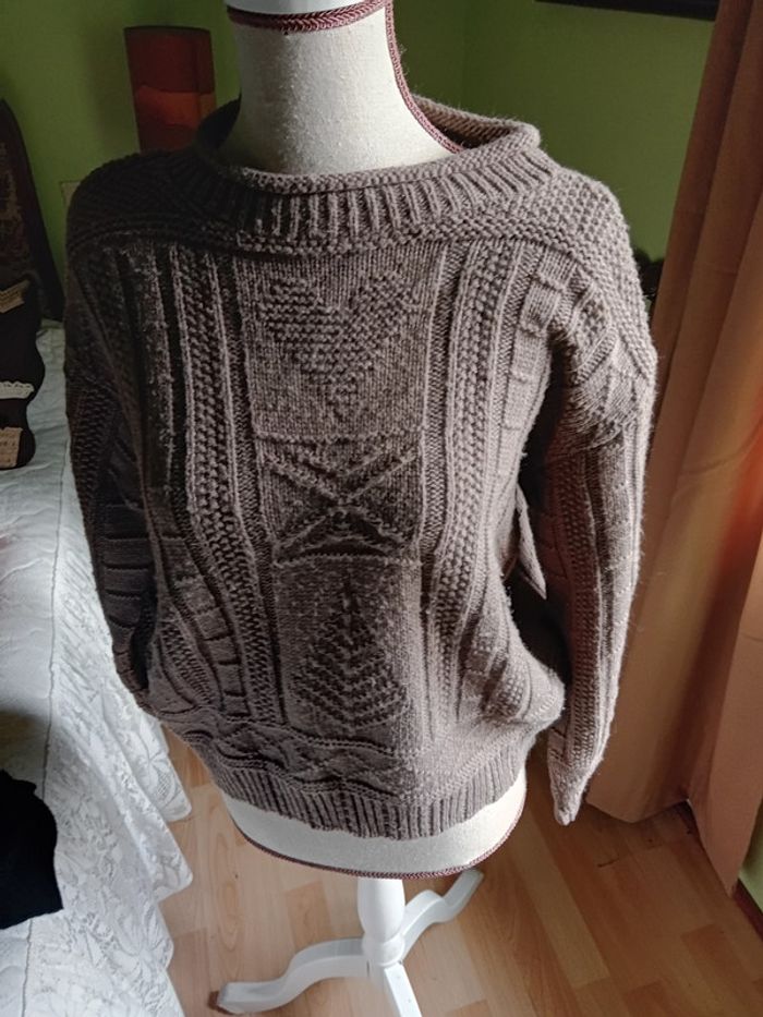 Pull manches longues taille 3, fabriqué en France, en 70% acrylique et 30% laine. Bon état général sauf petites bouloches sur le devant voir photo. Dimensions largeur épaules 52cm, longueur 54 cm.