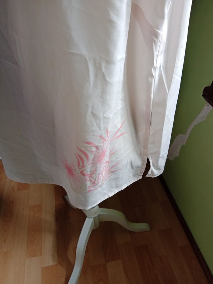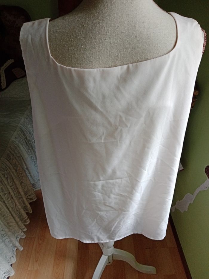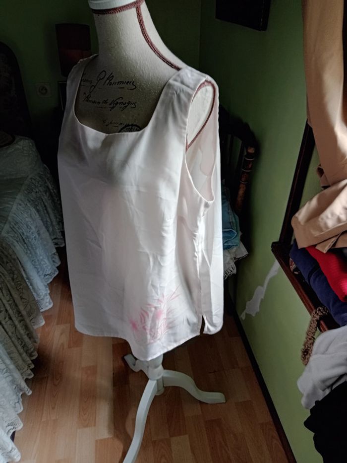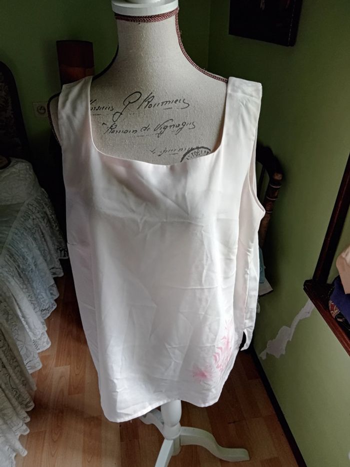 Débardeur de chez Daxon, taille 46, en 100% polyester. Très bon état général. Rose pâle avec fleurs rose plus foncées.