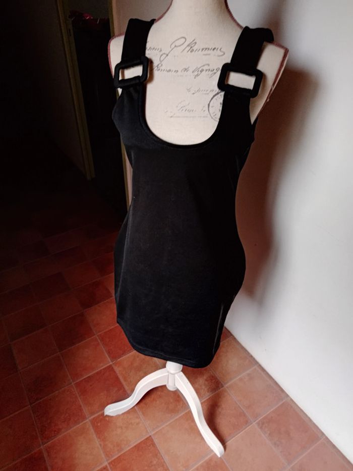 Robe noire à bretelles, taille 38, en 100% polyester. Très bon état.