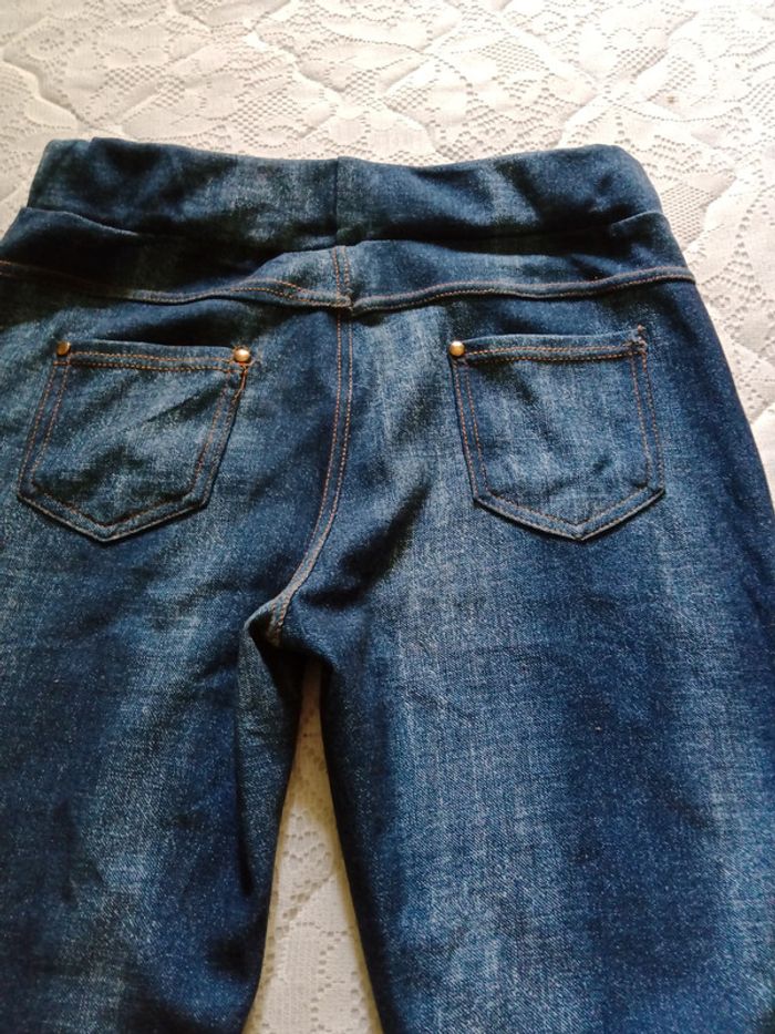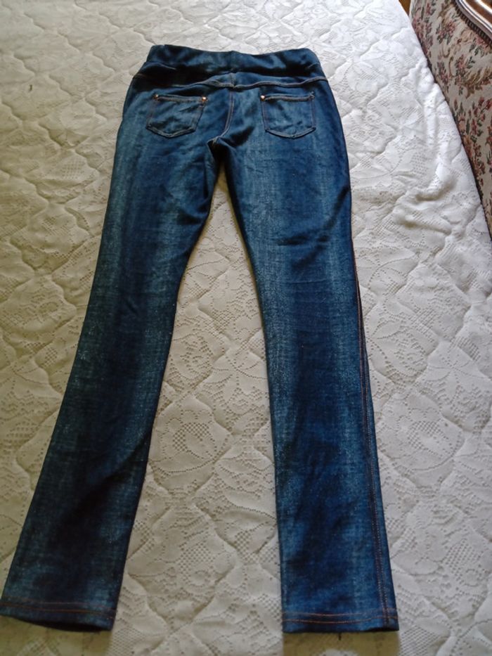 Legging couleur jean 👖, taille S/M, en 90% polyester et 10% spandex. Devant faux plis comme si il y avait une fermeture éclair. 2poches devant et 2 poches derrière. Très bon état.