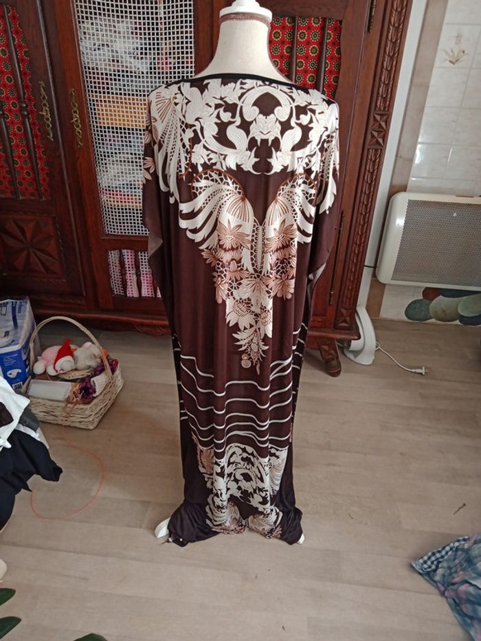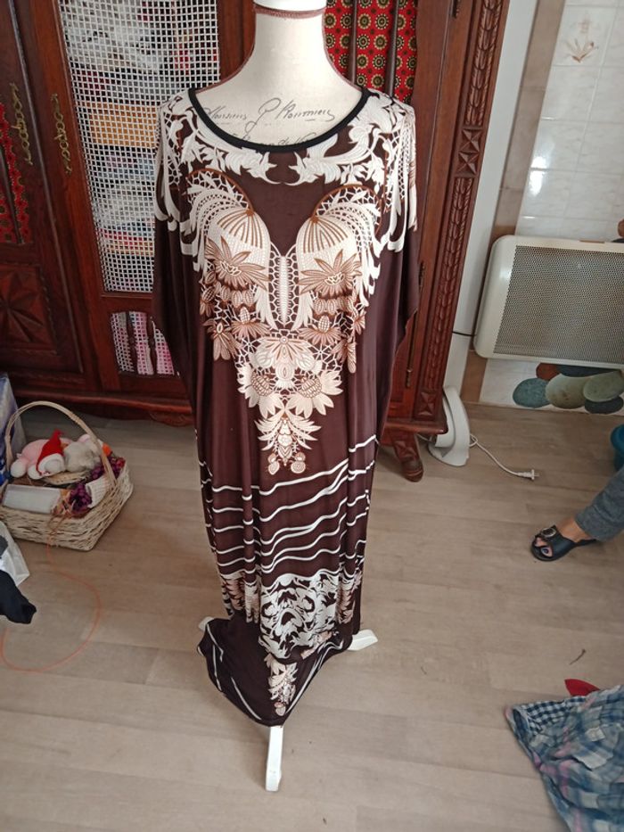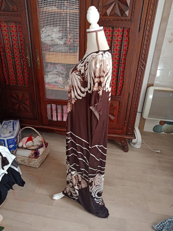 Robe longue sans manche, taille unique . En polyester. Bon état.