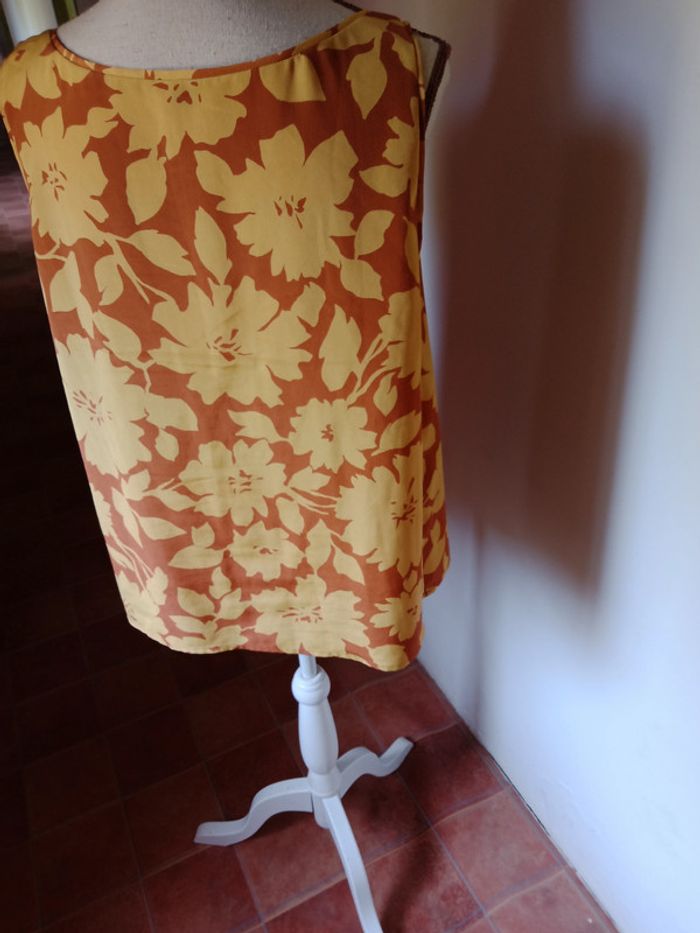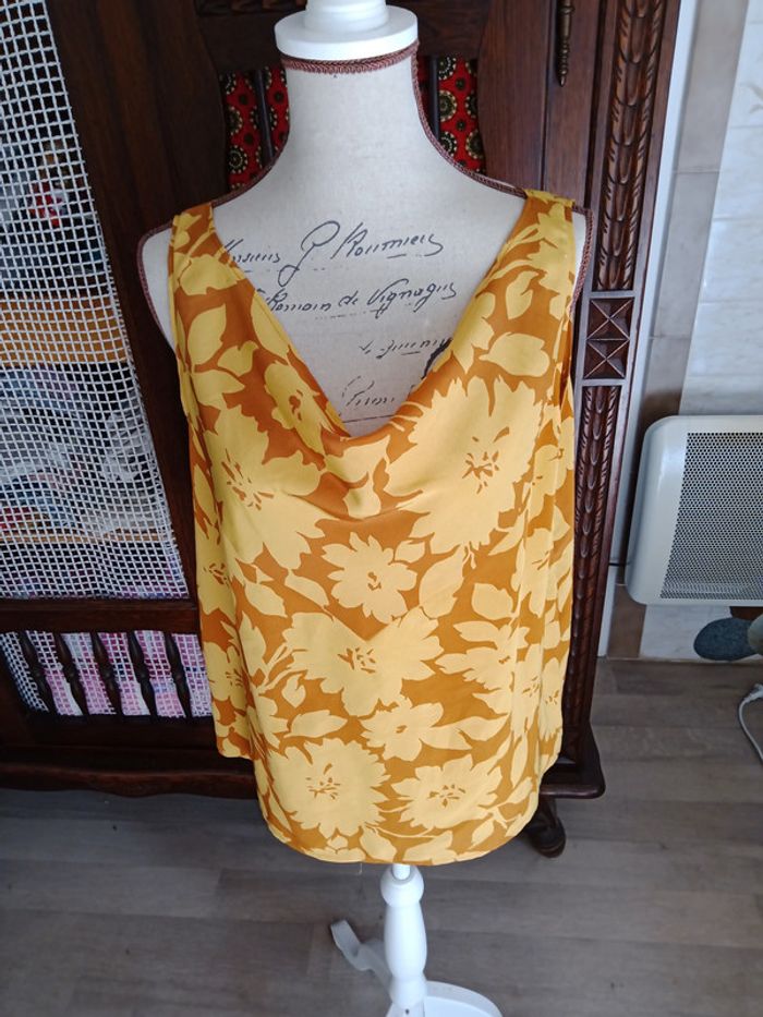 Haut femme sans manche de chez Rodier paris. En polyester, taille 38/40 . Couleur jaune moutarde et marron. Bon état .