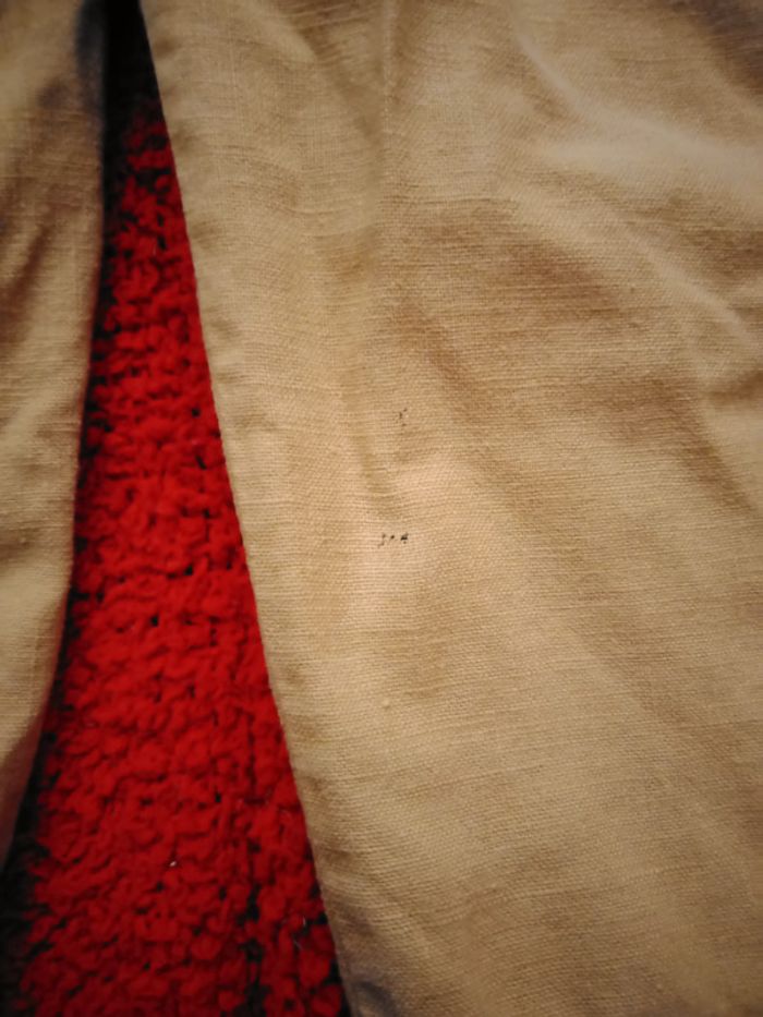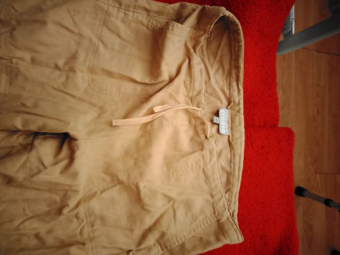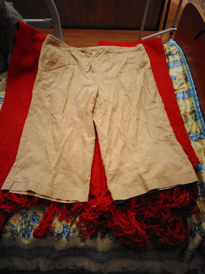 Pantacourt de chez Fashion Studio, taille 40, en 55% lin et 45% coton. 2 poches devant , 1 poche derrière et une sur le côté, lien à la taille pour serrer pantacourt. Très bon état sauf petite tâche derrière bas jambe droite voir photo.