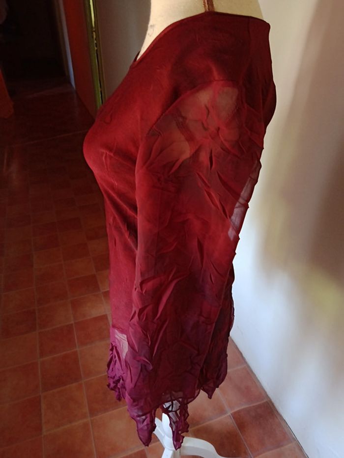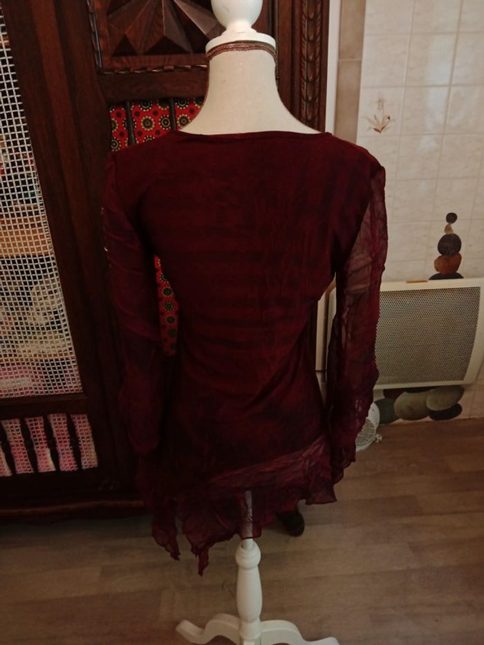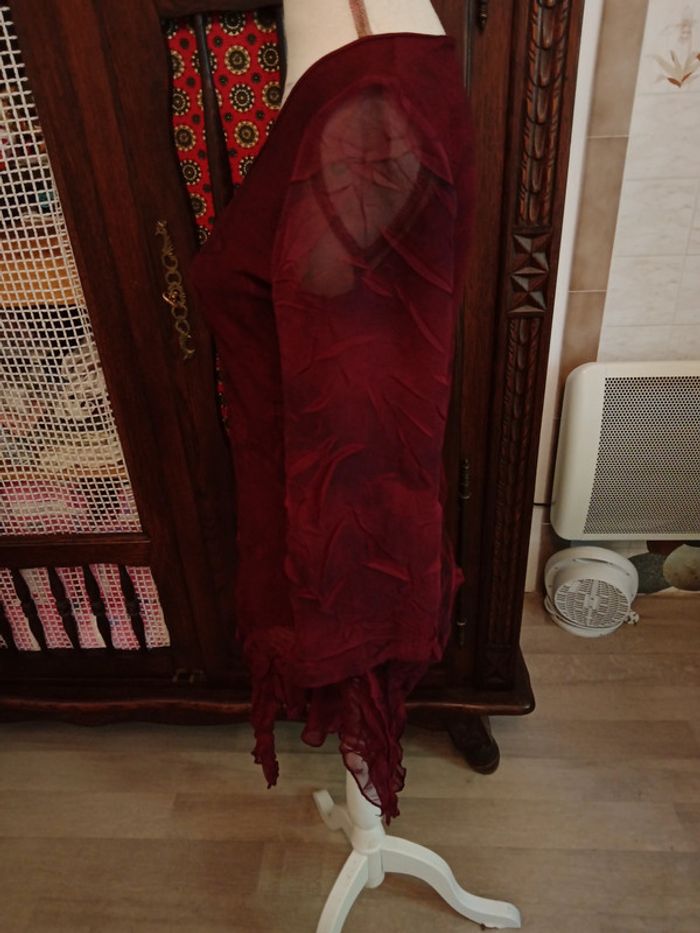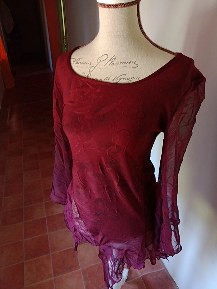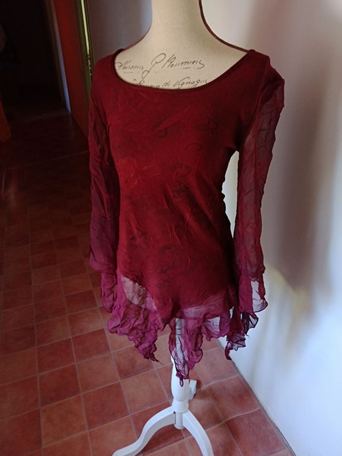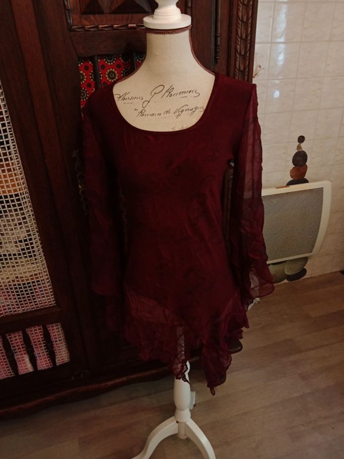Tunique manches longues , chauve-souris en tulle, couleur bordeaux, taille 38, en viscose et tulle. Très bon état