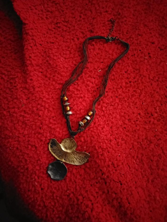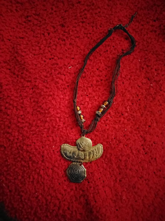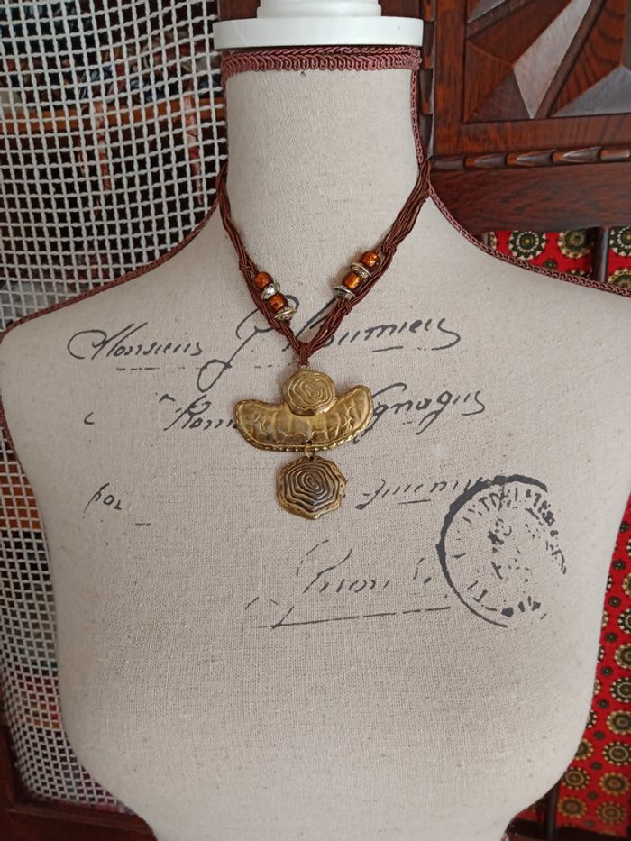 Collier fantaisie ras de cou, en métal, perles et lanières. Très bon état