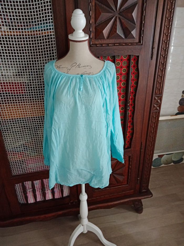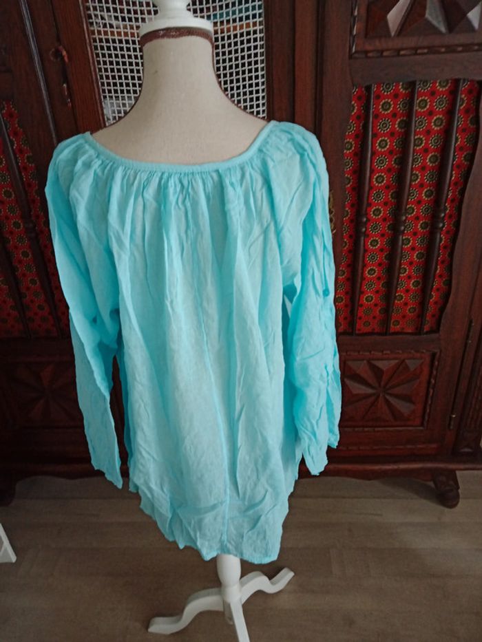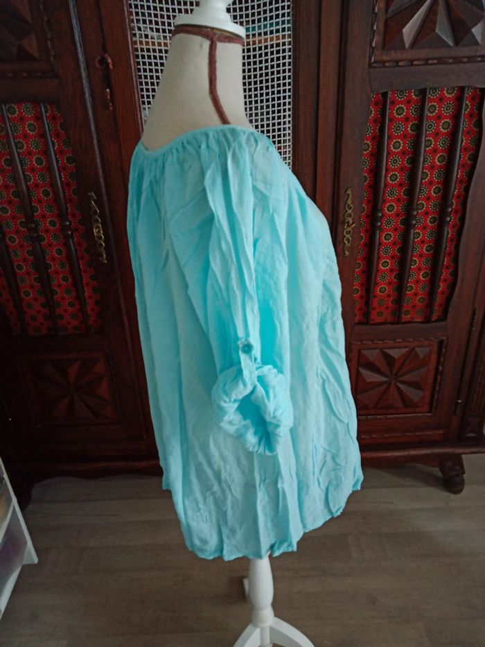 Haut turquoise à manches longues,pouvant se remonter grâce à un bouton, voir photo. 100% coton, taille 38/40. Très bon état.
