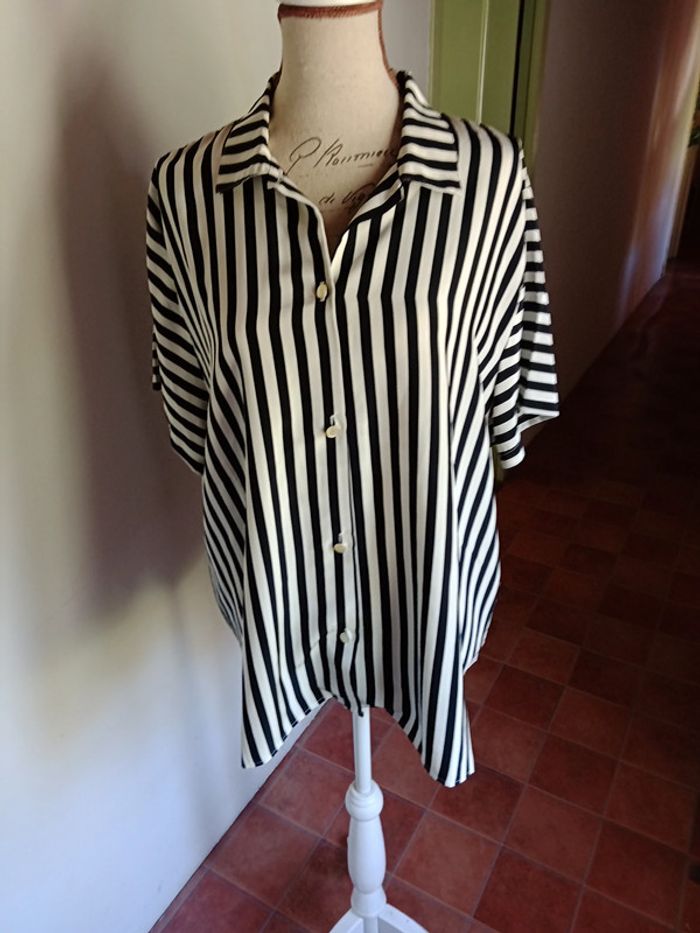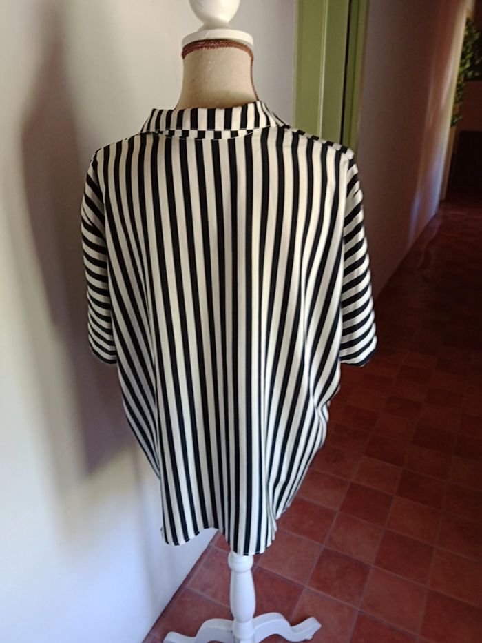 Chemisier rayé noir et blanc, fabriqué en France, 100% polyester, très bon état.