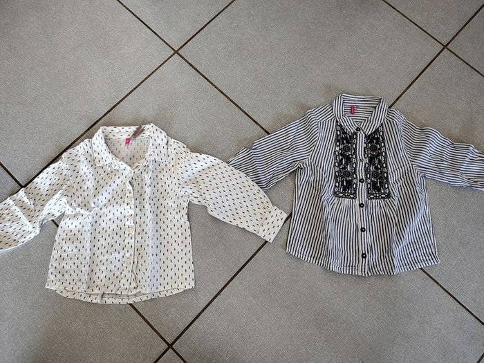 Lot de 2 chemises manches longues : • 1 blanche avec traits noirs. Matière légère • 1 blanche rayé bleu. Broderies sous l'encolure. 100% coton Ouverture boutonnée sur le devant. Boutons aux poignets Taille 2 ans (92 cm) Très bon état Foyer non fumeur