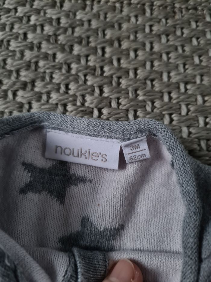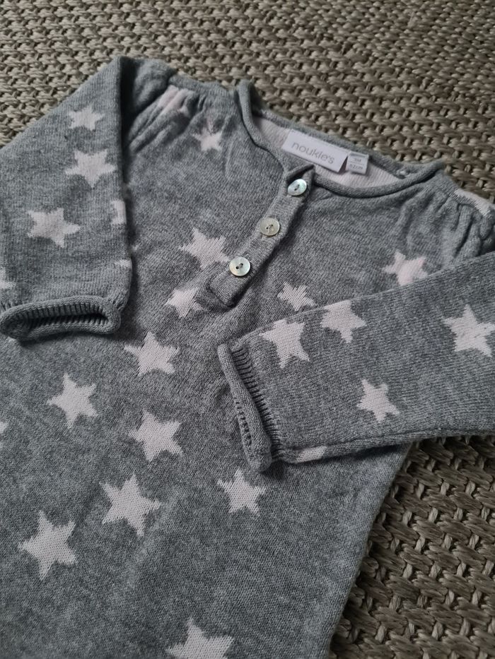 Combinaison douce grise mixte avec motifs étoiles en parfait état. Très peu portée. Elle s'associe très bien avec le boléro gris qui est vendu avec un autre ensemble. Photos disponible sur demande. Matière extensible donc peut aller sur du 4/5mois. Taille 3 mois - 62cm - marque Noukie's Envoi Rapide et Soigné J'applique des réductions sur lots. Photos supplémentaires possible sur demande