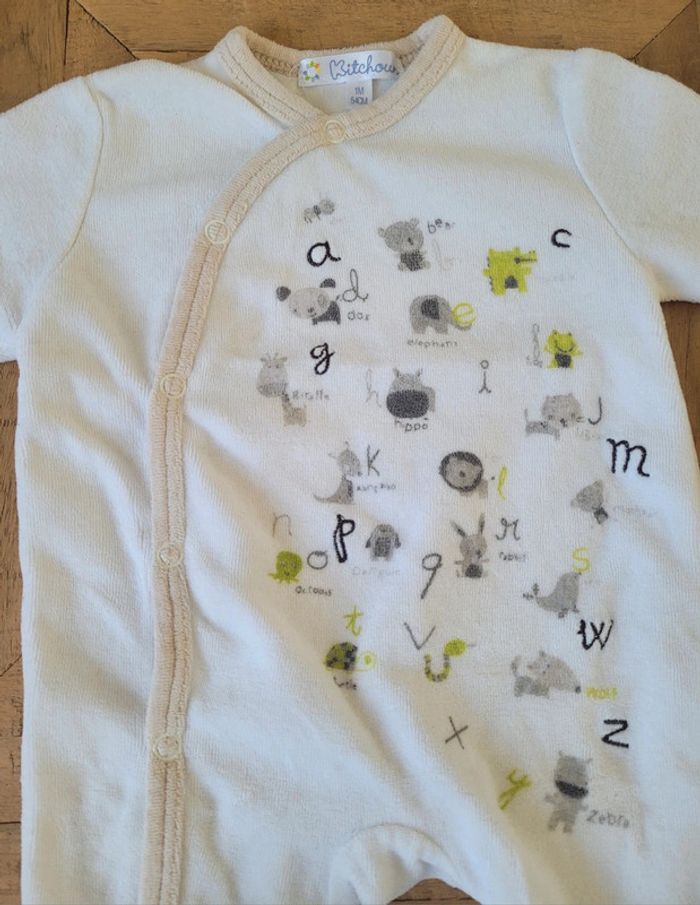 Pyjama alphabet 1mois Ouverture devant, pression OK Très bon état 🌸 Dressing trié par taille, faites vos lots 🌸 Remises et réductions raisonnable sur lot #flowinefille1mois #flowinegarcon01mois
