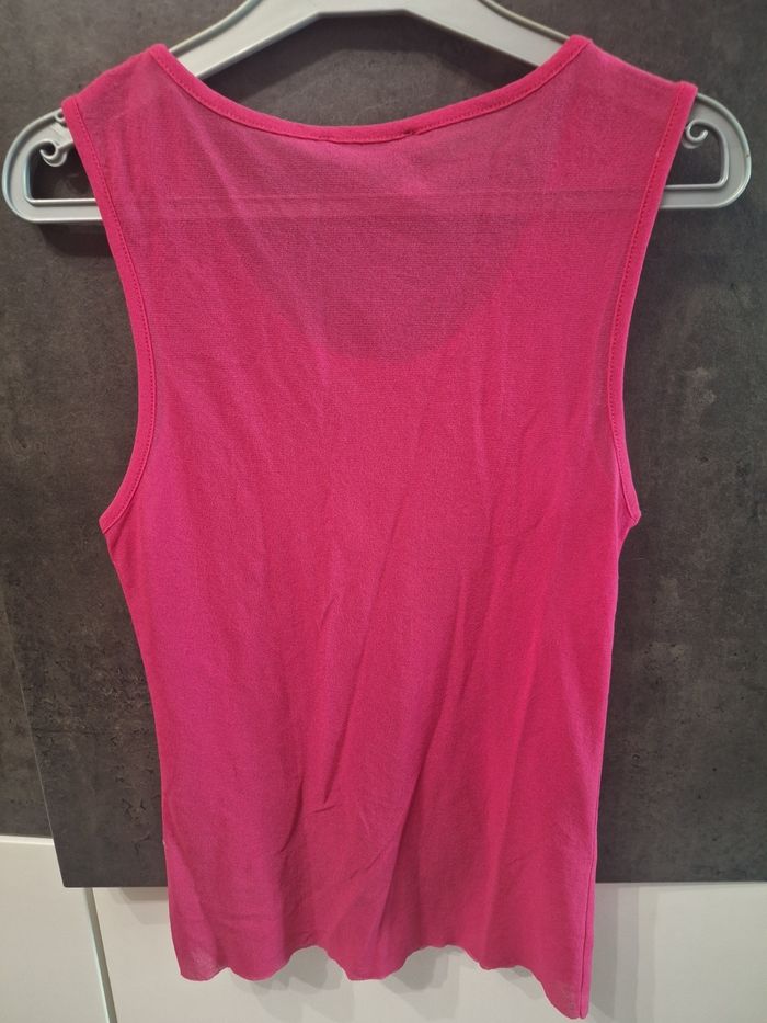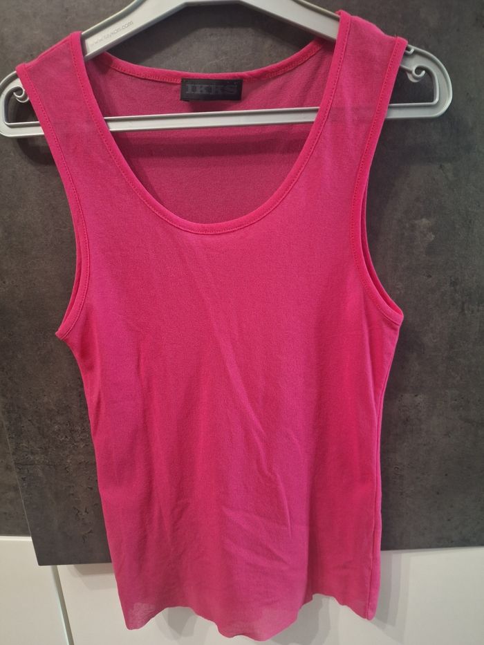 Joli débardeur très léger, tissu voile transparent fuchsia, marque IKKS, taille 38, peu porté en très bon état