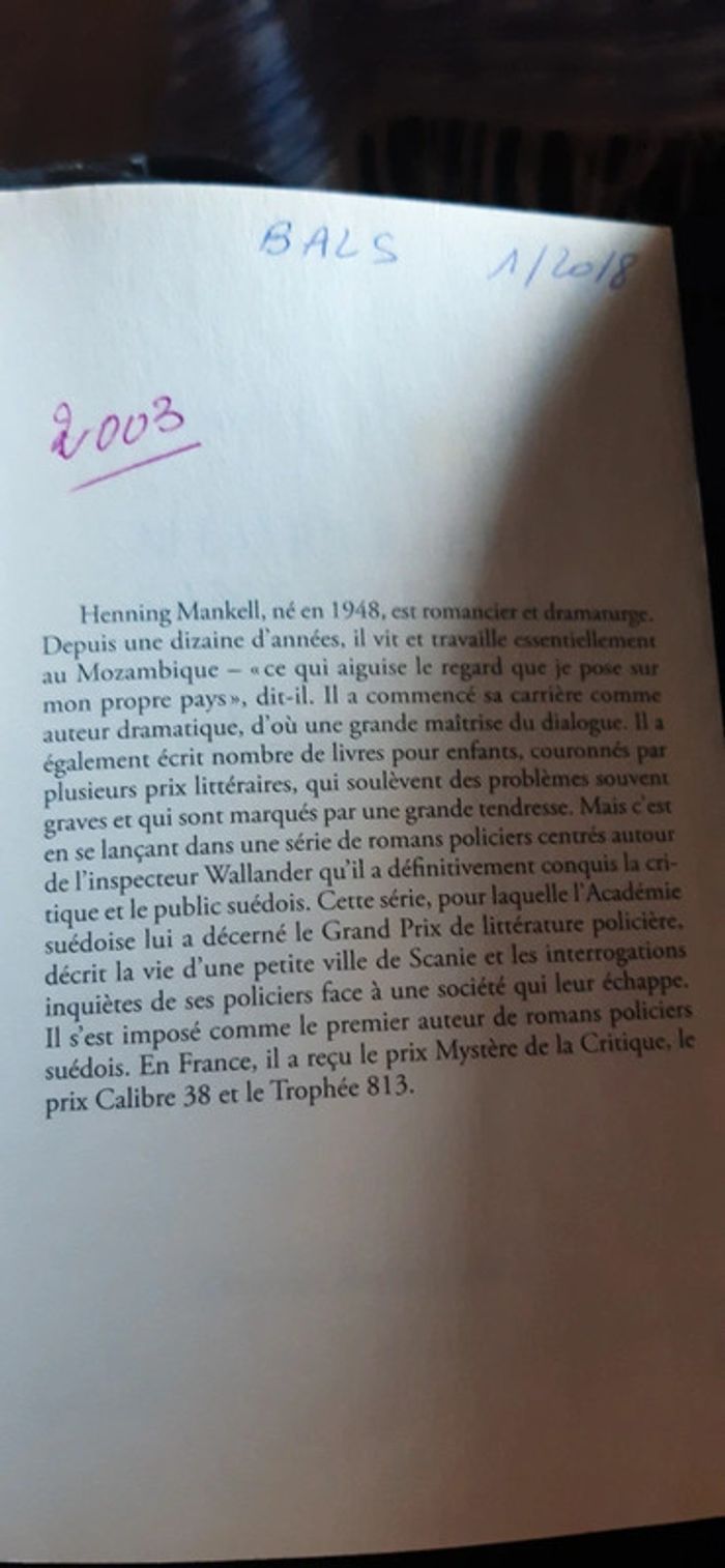 Très bon état (juste quelques écritures sur une page - photo 3) En pleine campagne suédoise, dans une ferme isolée, un couple de paysans retraités est torturé et sauvagement assassiné. Avant de mourir, la vieille femme a juste le temps de murmurer un mot : " étranger ". Il n'en faut pas plus pour qu'une vague de violence et d'attentats se déclenche contre les demandeurs d'asile d'un camp de réfugiés de la région. Les médias s'emparent du fait divers et lui donnent une résonance nationale. La pression augmente sur les épaules de l'inspecteur Wallander, chargé de mener l'enquête. Il va devoir agir vite, avec sang froid et détermination, et sans tomber dans le piège de la xénophobie ambiante qui brouille les pistes... La première enquête du désormais célèbre Kurt Wallander, personnage phare des romans de Henning Mankell.