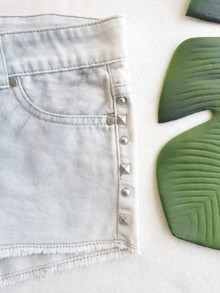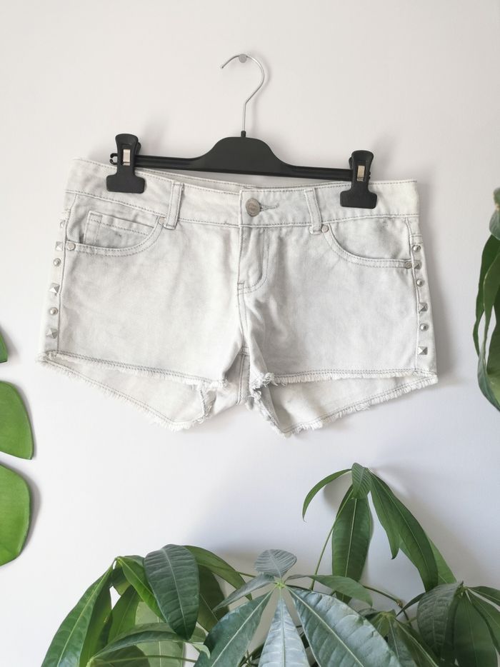 🙎‍♀️ ÉTAT DE L'ARTICLE: 8/10 ✅ Très bon état Short en jean à clous 👩 Mim Taille 34 • Matière: 100% coton • Taille basse • Coupe courte • Fermeture zippée ➕ bouton 🔘 • 3 poches avant - 2 poches arrière • Passants pour ceinture • Base effilochée • Détails clous sur les côtés • Couleur: Gris clair delavé effet tie & die Très bon état
