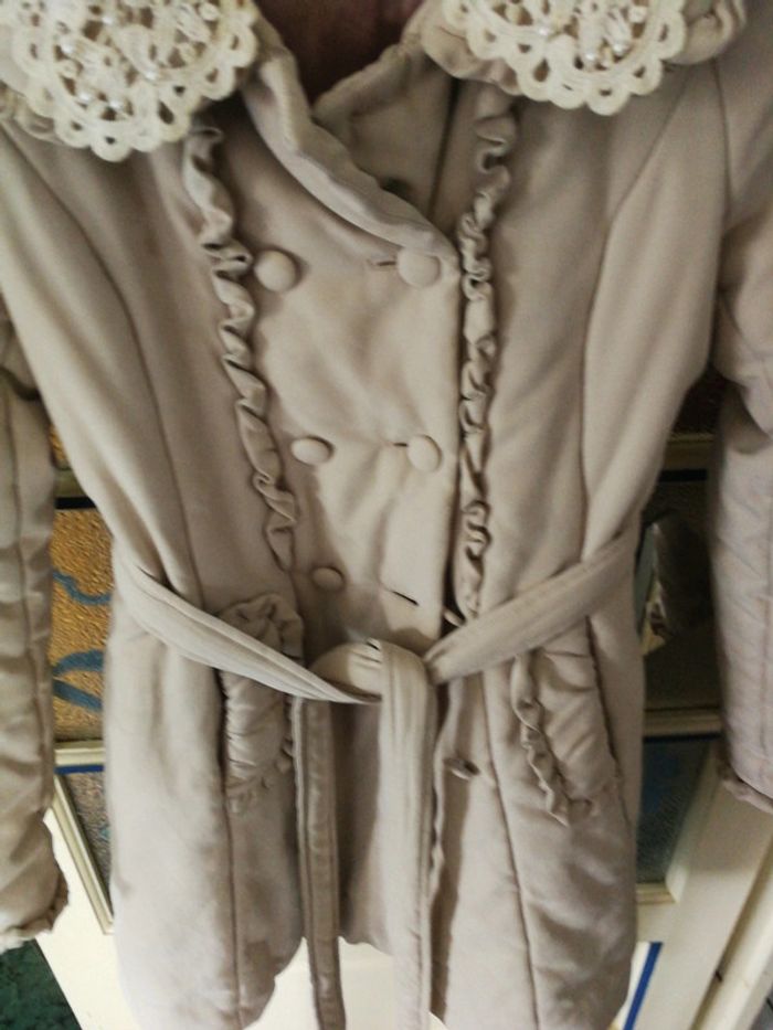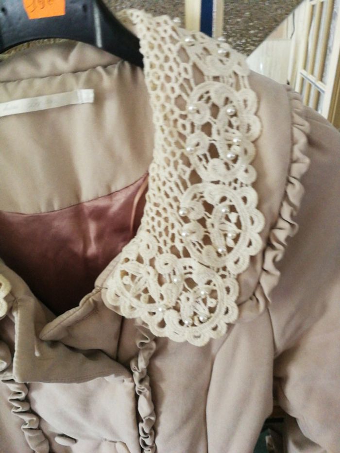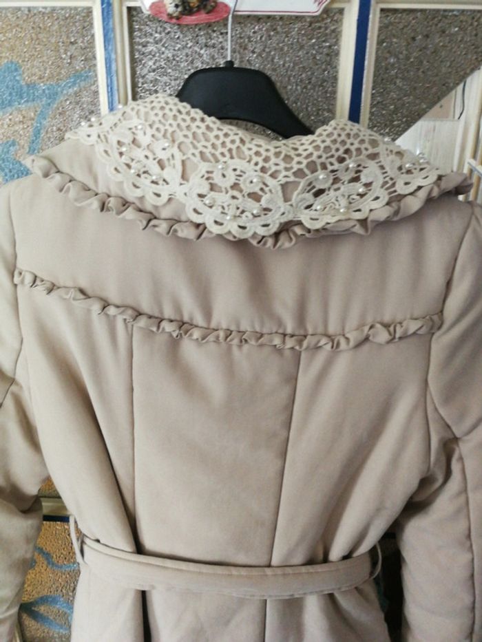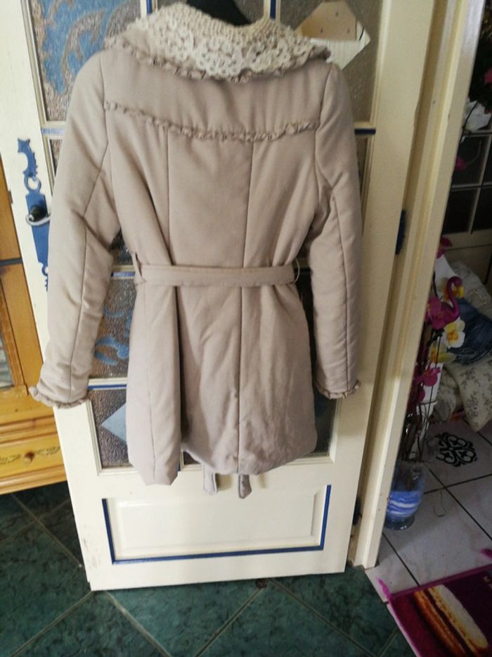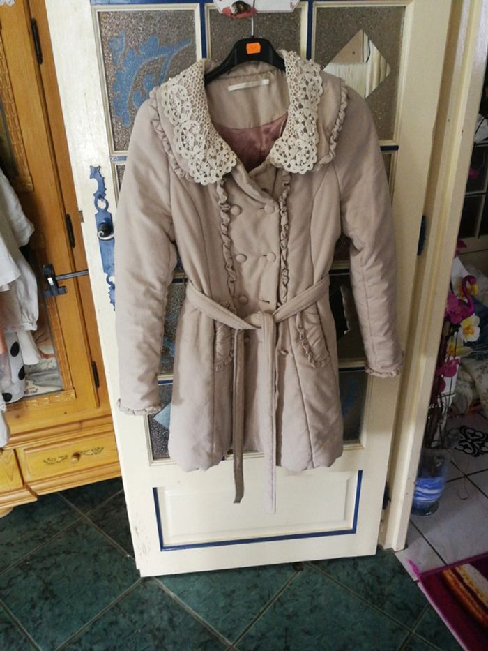 Manteau entièrement doublé très chaud avec col en dentelle ceinture poches et une petite ouverture à l'intérieur lavable en machine taille indiquée s mais taille grand aisselle à aisselle 45 cm comme neuf