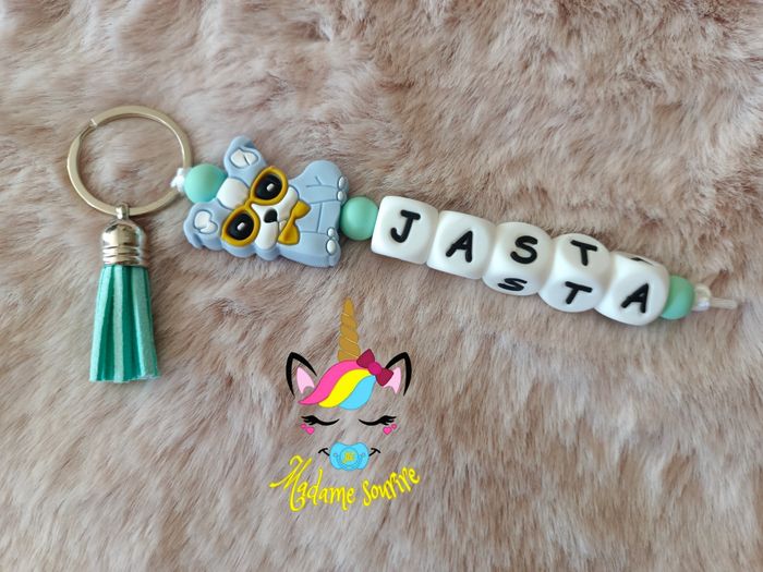 Un porte clés 1 branche Bouli chien pour accrocher vos clefs en toute sécurité, composé de perles en silicone alimentaire et/ou bois naturel.