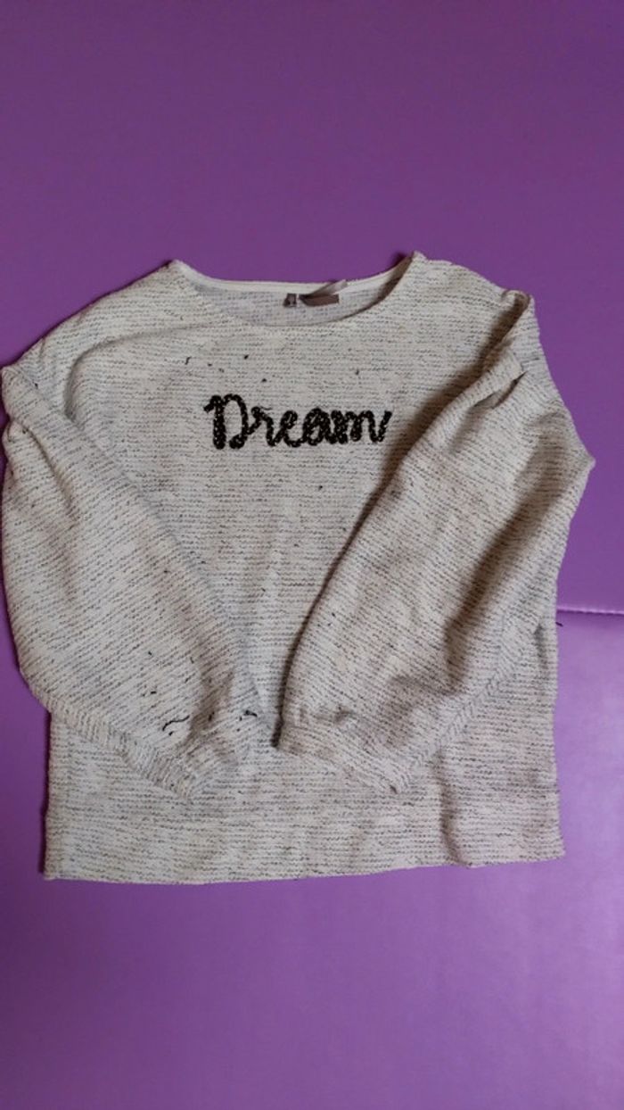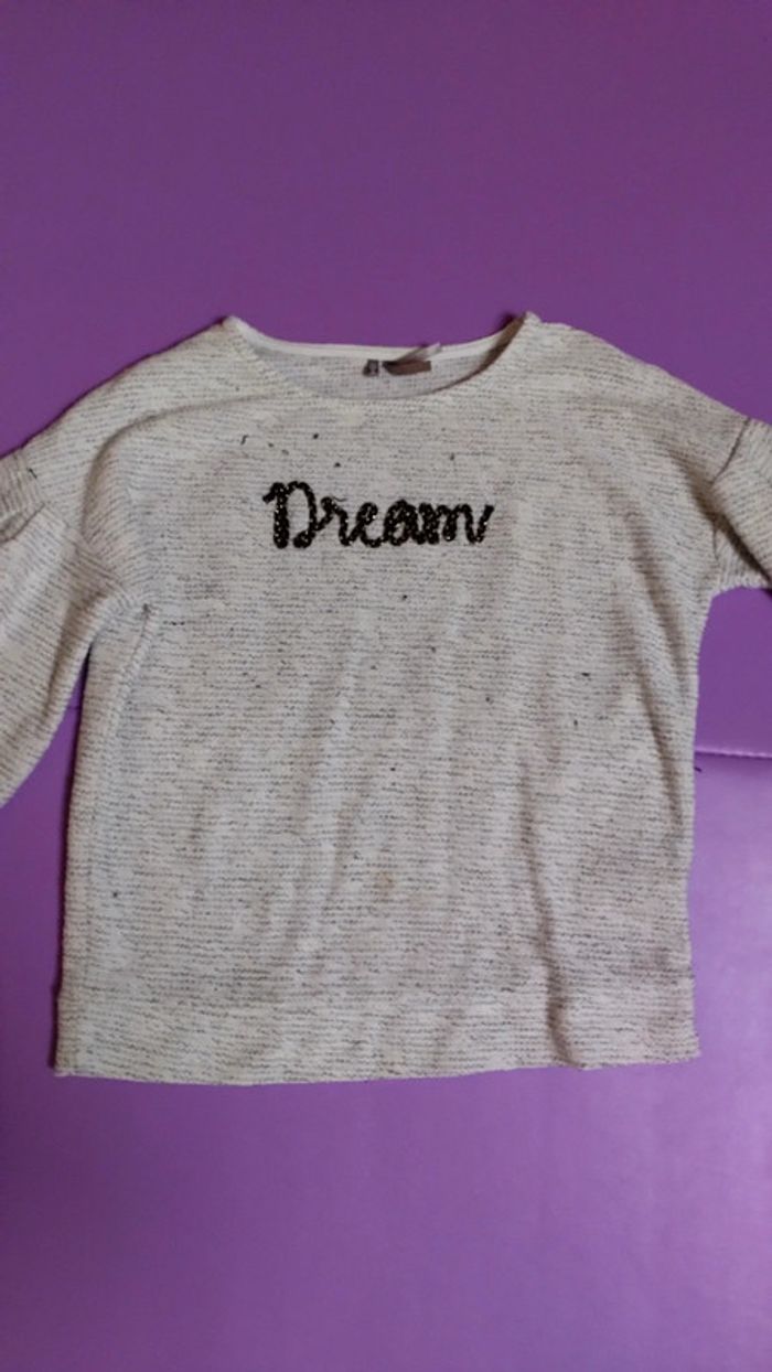 Beige avec motif Dreams brillant. Manches 3/4 et bouffantes. Bon état