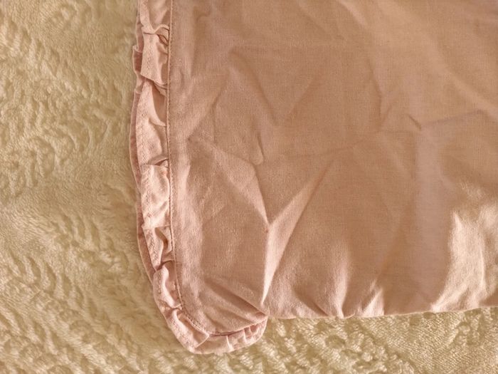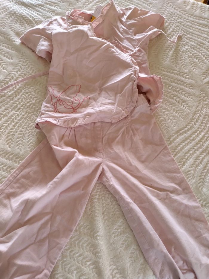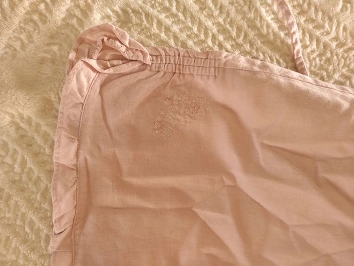 Haut forme portefeuille avec fermeture par noeud. Pantalon court comme 7/8 ème mais large. Réglable a la taille par élastiques. Très chic Rose pâle. Bas de pantalon avec petit motif. Attention un des pieds a de petites tâches.( Voir dernière photo)