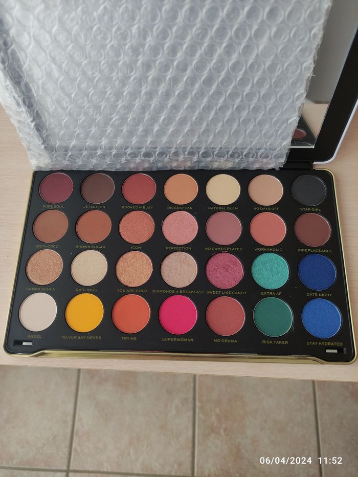 Palette jamais utilisée, 28 fards à paupières. Taille moyenne.Bonne pigmentation.