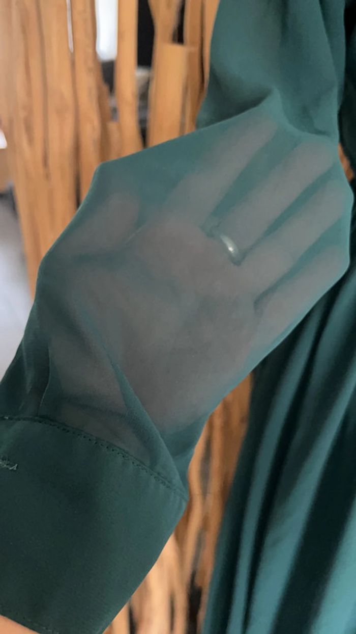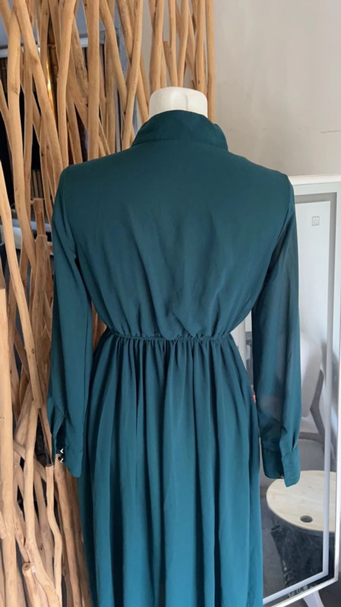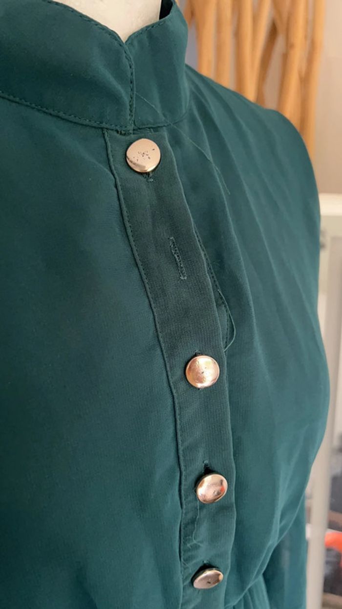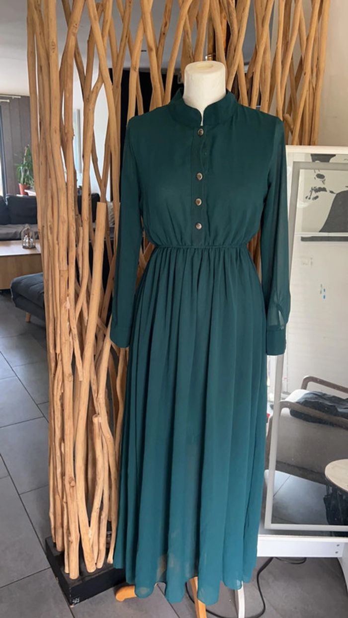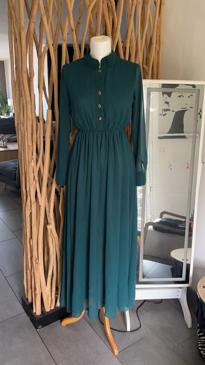 Jolie robe vintage vert bouteille Taille 38 Avec 2 poches Doublée jusqu’au genoux Manque 1 bouton à l’encolure et 1 au poignet je n’ai pas retrouvé les mêmes en boutique