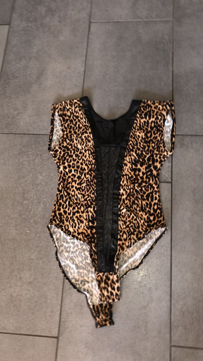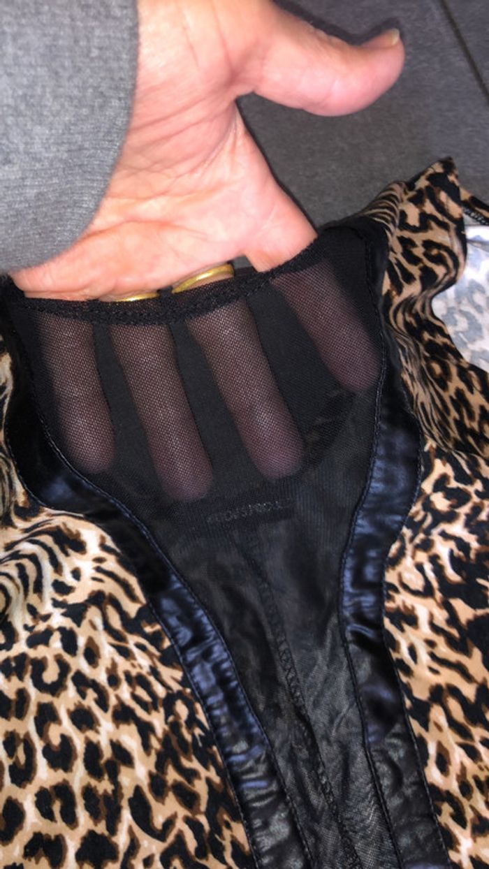 imprimé léopard grand V devant en filet résille bordé cuir