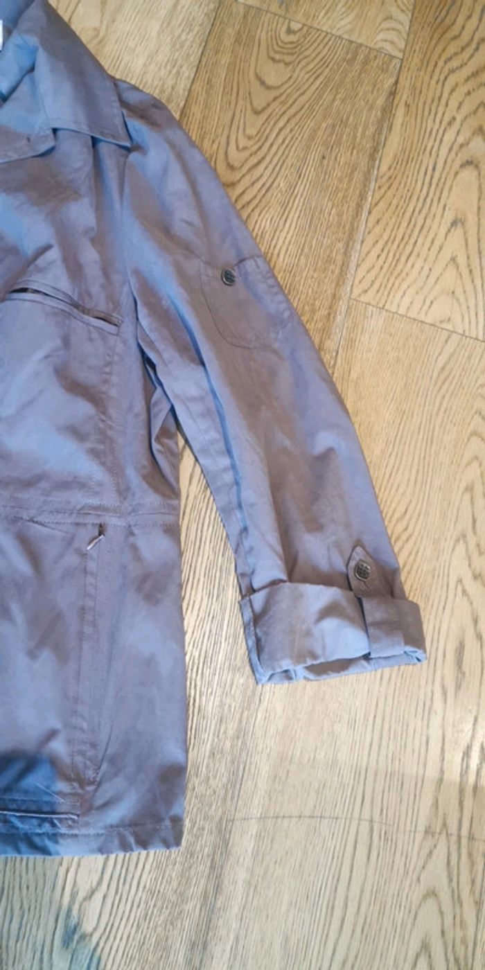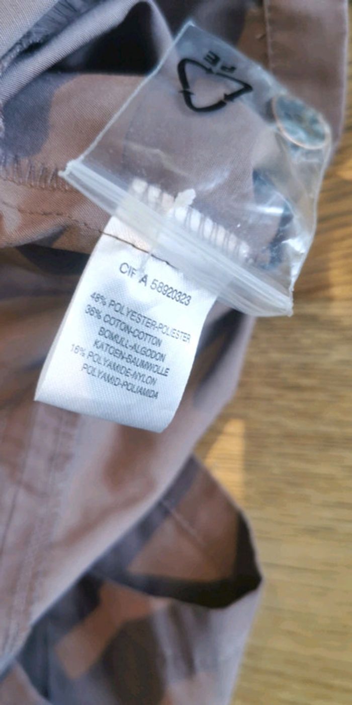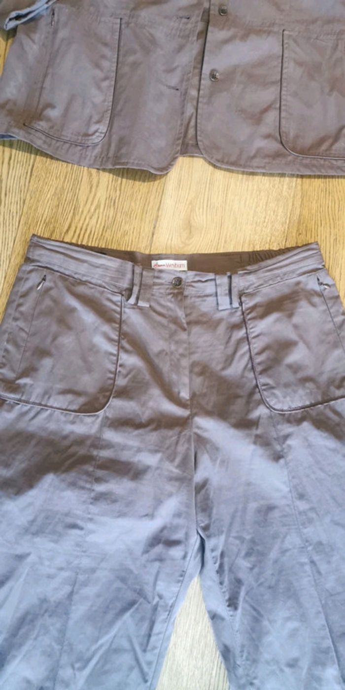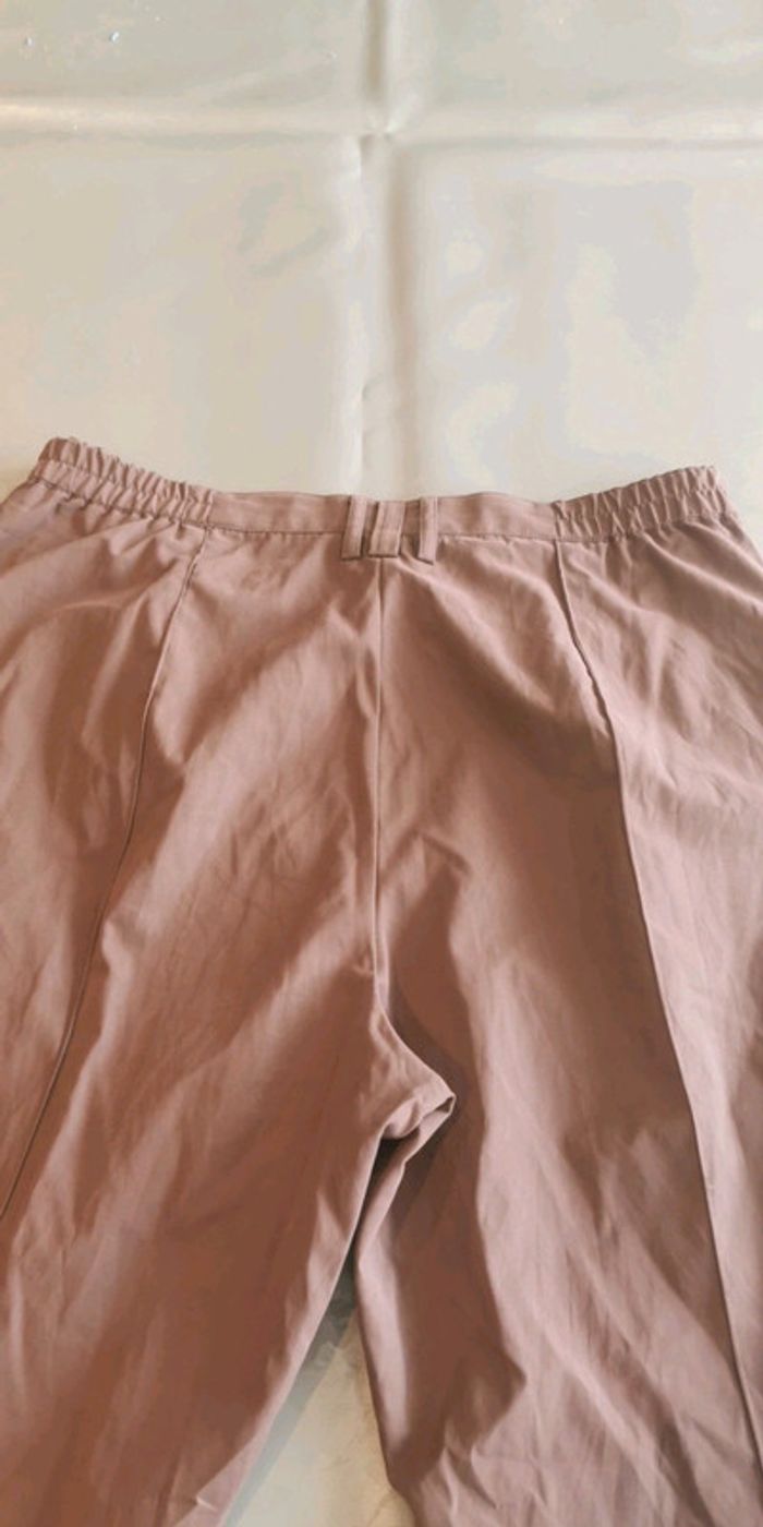 Jamais porté en microfibre. Manches retroussables. Taille 46 Pantacourt avec élastiques sur les côtés de la taille. Couleur lit de vin clair.
