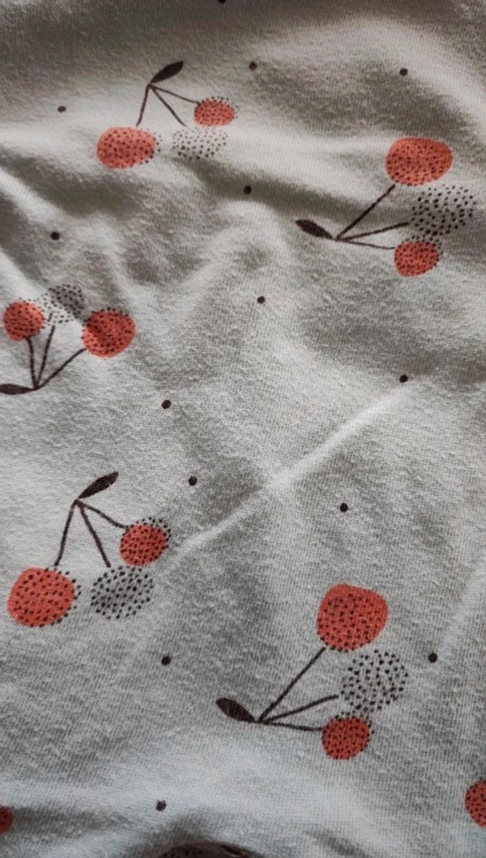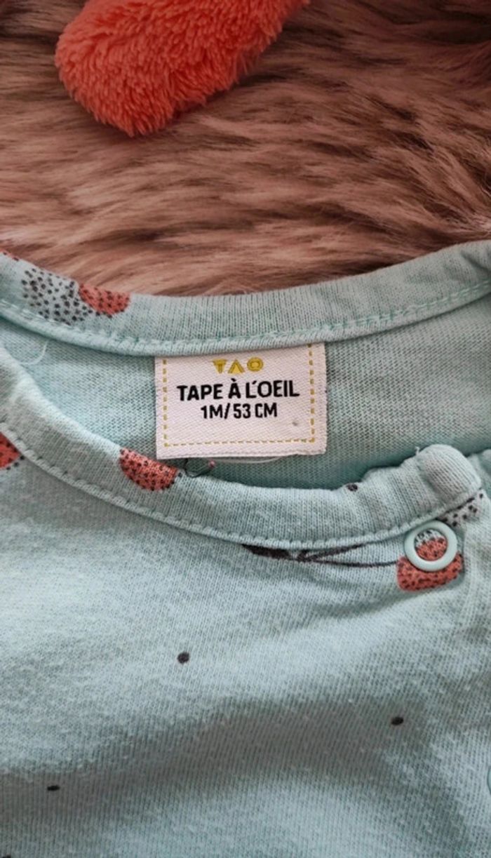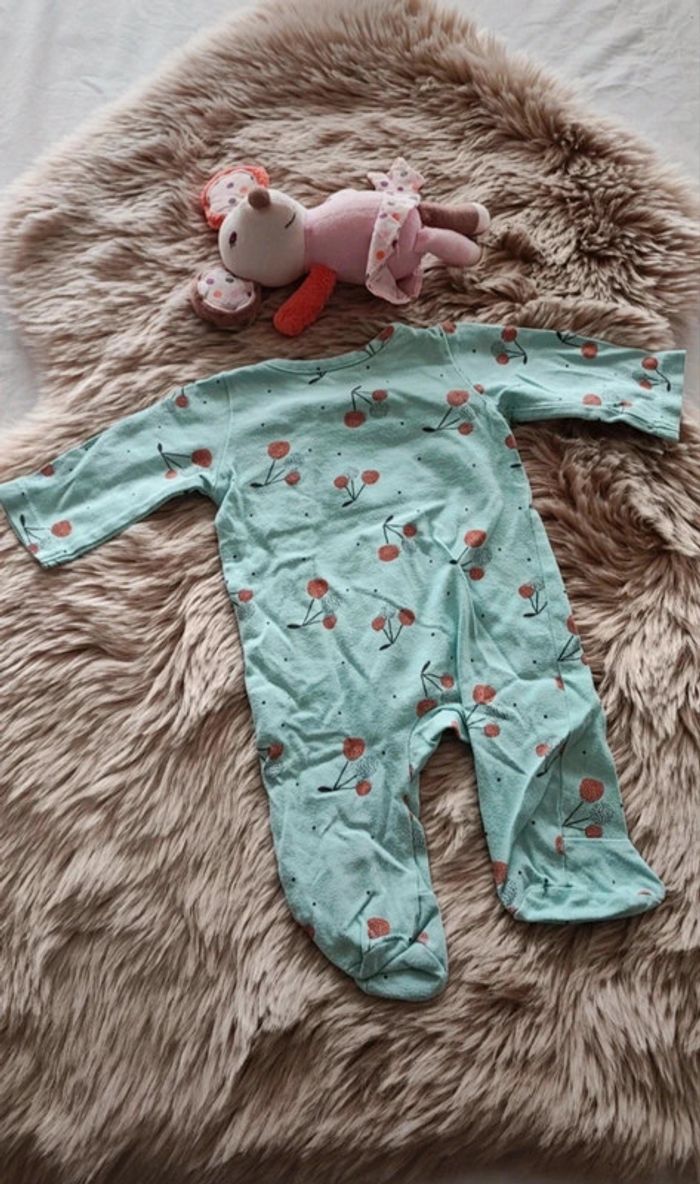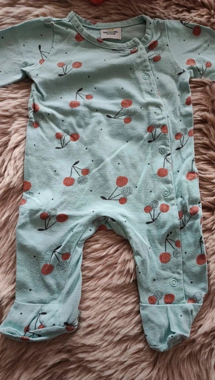Pyjama fin turquoise avec des cerises. Ouverture sur le devant. De la marque tape à l'oeil En taille 1 mois En bon état - un peu bouloché Maison non fumeur #laetitia33700filleunmois
