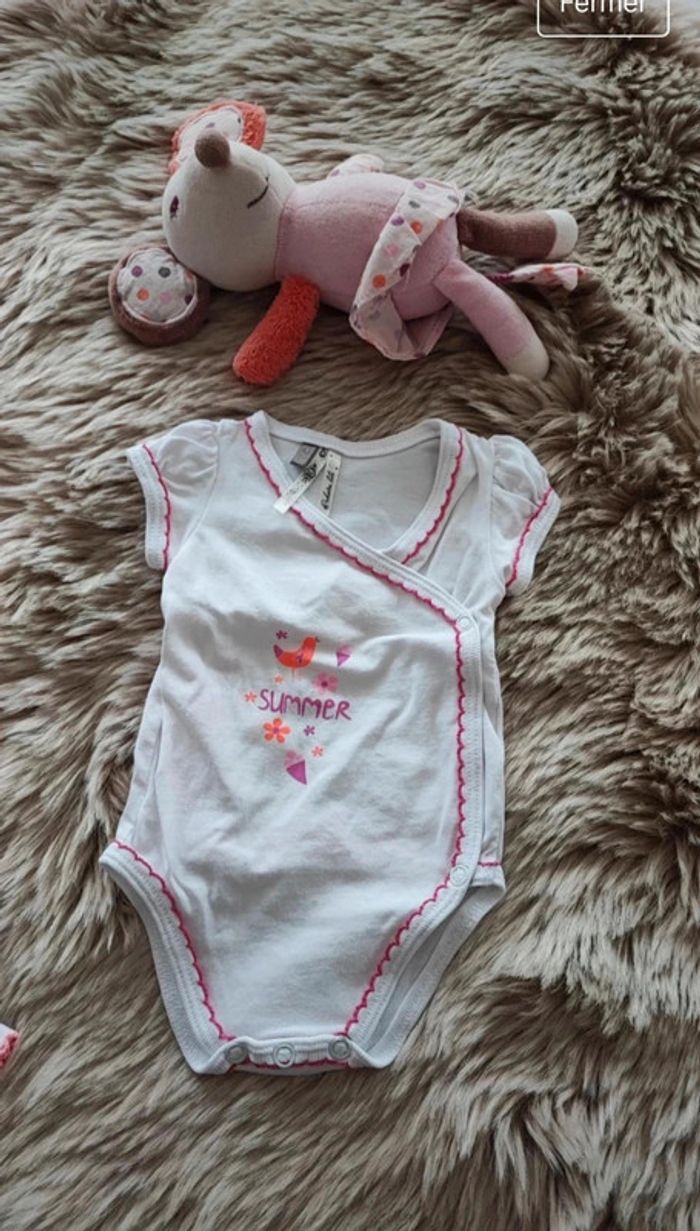 Lot de 3 bodies blanc et rose clair avec ouverture sur le devant. De la marque orchestra En taille 1 mois En très état pour les 2 blancs et en bon état pour le rose clair. Maison non fumeur #laetitia33700filleunmois