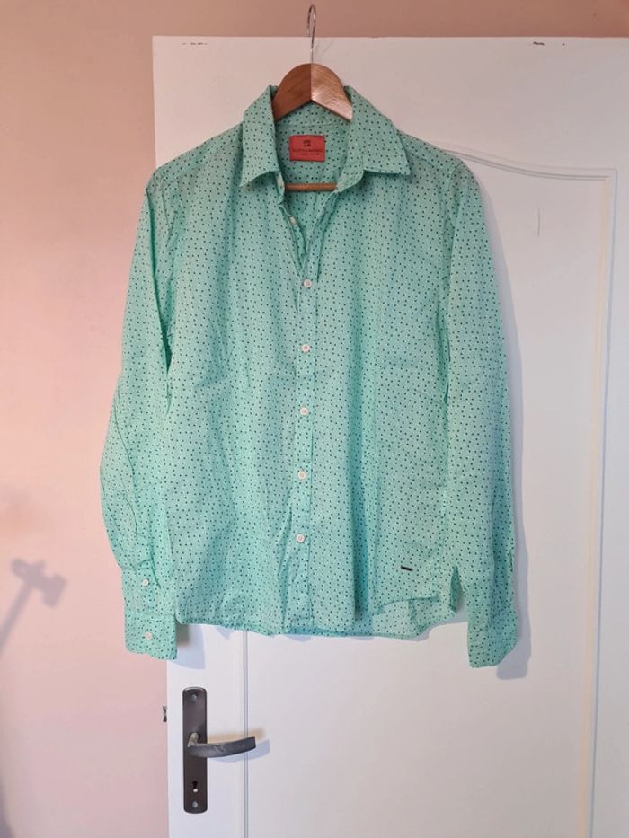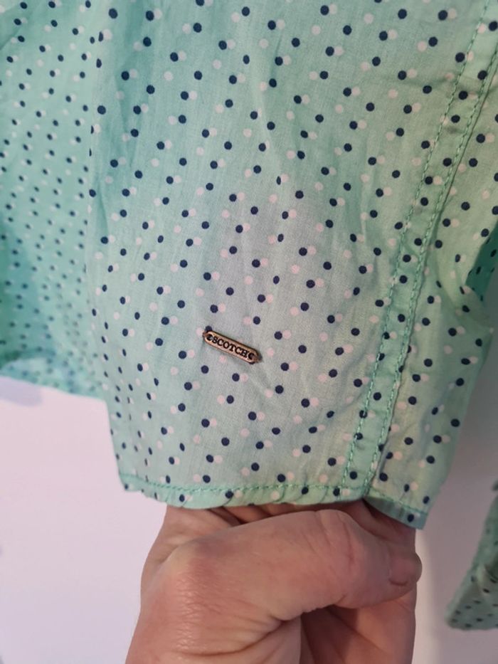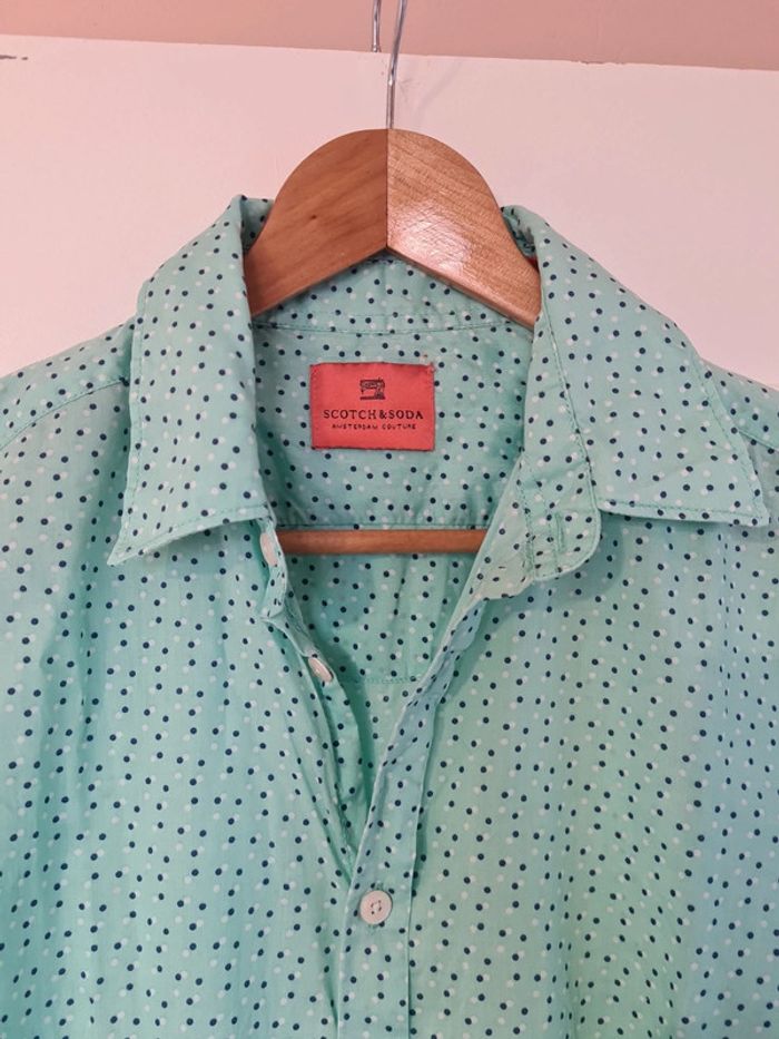 Chemise vert d'eau, vert pâle / pastel à pois bleu marine et blanc de la marque Scotch et Soda Amesterdam Couture en taille S Tout les boutons sont présents, voir les photos. Parfait état et très agréable à porter.