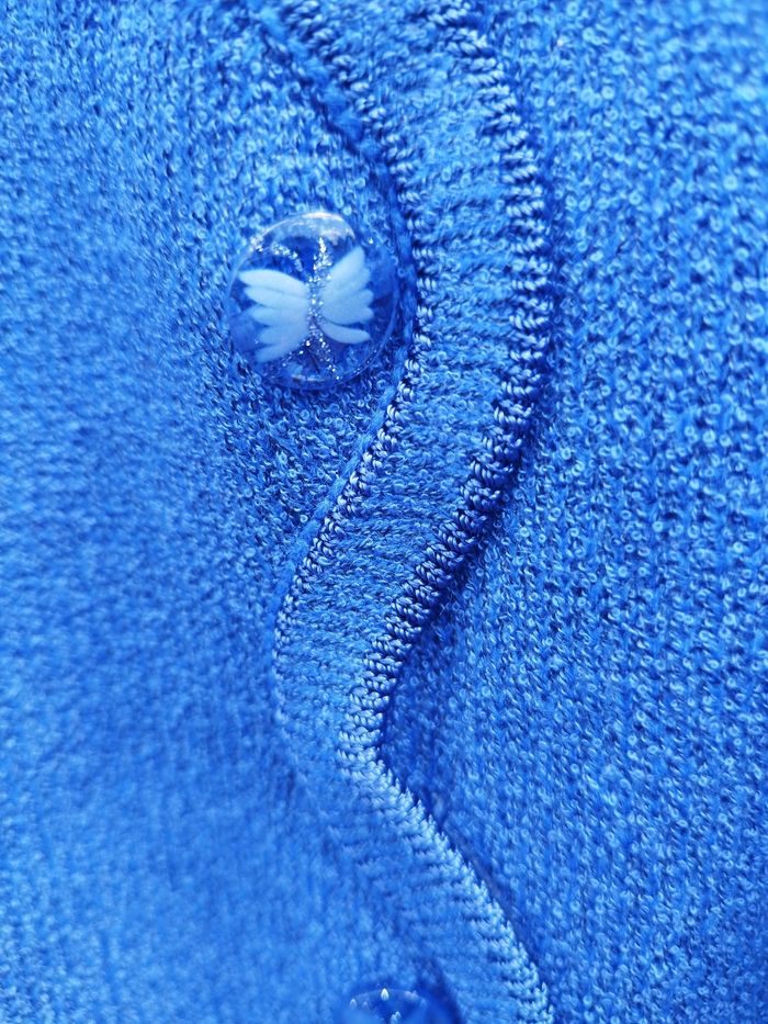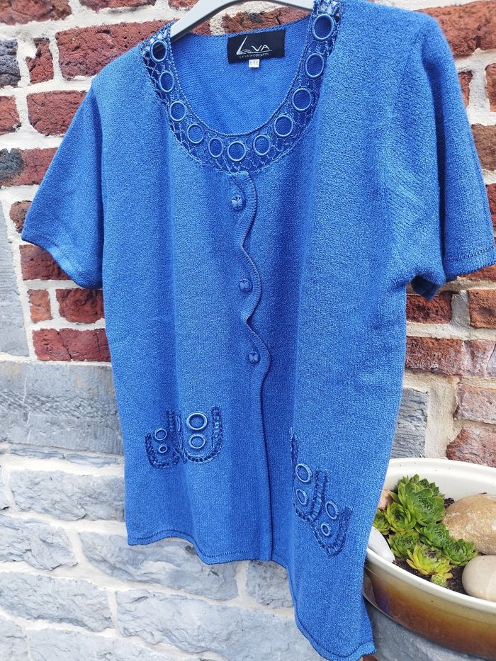 Magnifique petit pull d'été pour les soirées un peu plus fraîches Léger et très agréable à porter Nombreux détails décoratifs Fente en bas de chaque côté 100% acrylique En excellent état Taille XL/XXL