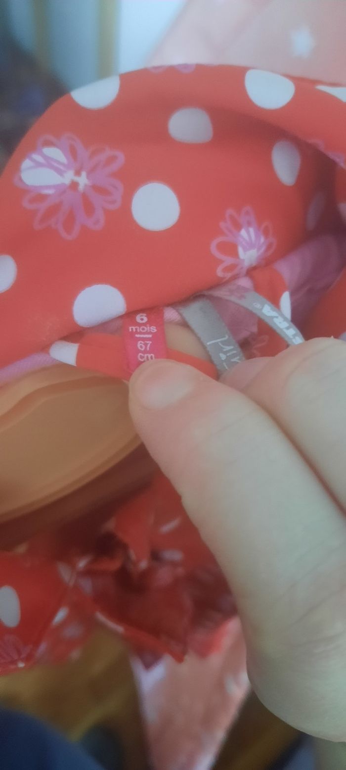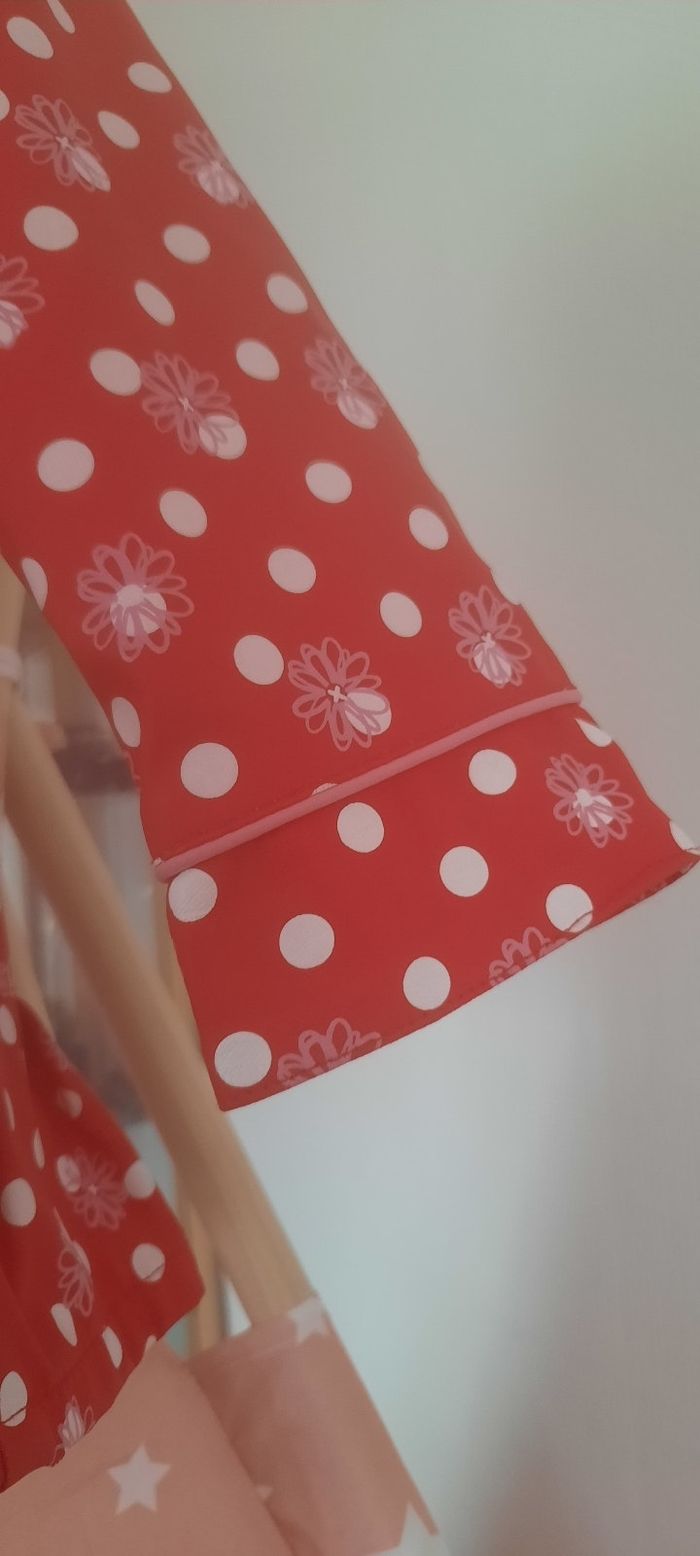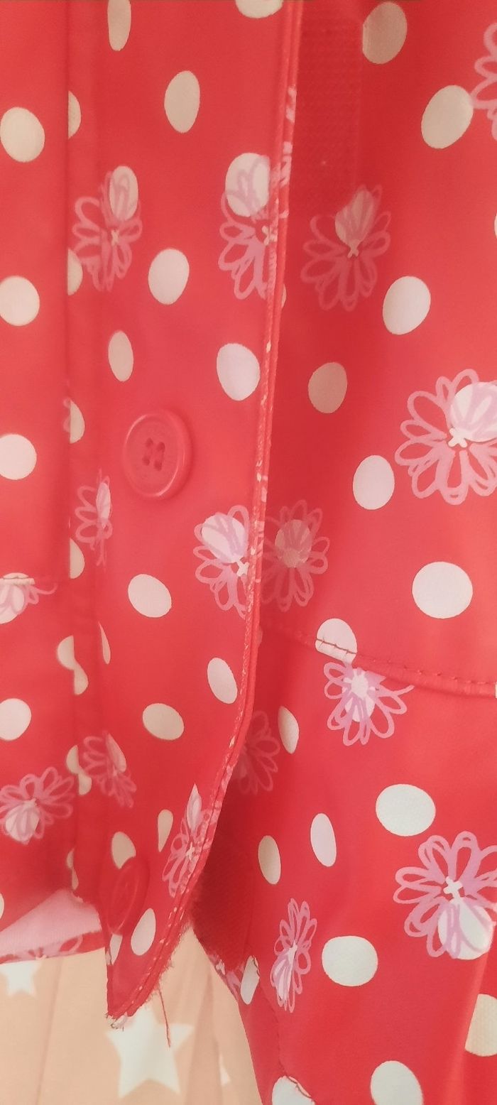 De la marque Orchestra porté mais en bon état. Petite trace à l'endroit de la fermeture mais trace d'usure. Pas de déchirure, ni rayure. Couleur rouge à petits pois blancs et fleurs rose. Petite coupe féminine. Complément de photos si besoin.