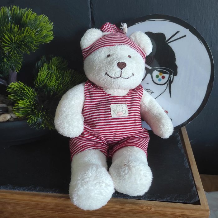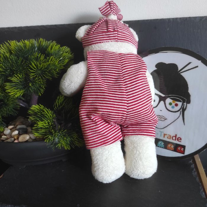 Peluche ours The Baby Collection blanc salopette rayée rouge nicotoy bonnet Ancien Vintage
