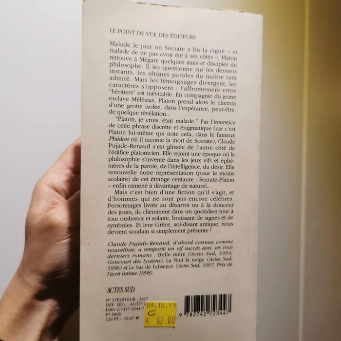 "Platon, je crois, était malade ce jour-là", cette phrase du dialogue de Platon, Phédon renvoie au jour où Socrate a bu la ciguë. Pour Claude Pujade-Renaud, l'absence du disciple aux côtés de son maître le jour de sa mort constitue une énigme qu'elle restitue dans ce roman. Après la mort de Socrate, Platon, entre culpabilité et confusion, se retire dans une grotte pour s'apaiser. Dans son esprit émerge alors le projet qui fera entrer Socrate dans l'histoire et le mythe : les dialogues platoniciens.