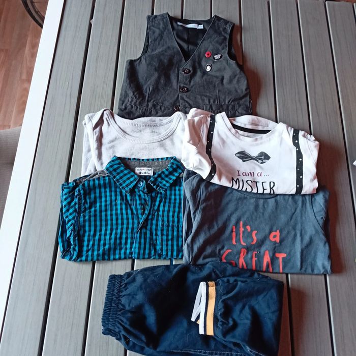 Lot de vêtements pour garçons : 2 hauts a manches longues 1 gilet sans manches 1 chemise manches longues 1 bodie manches longues 1 pantalon bleu marine Comme neuf