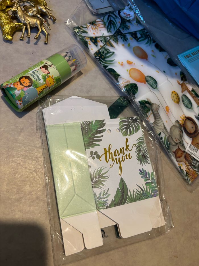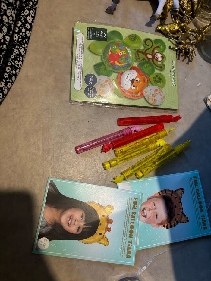 1 ballon lion à poser sur une table 1 lot de ballons savane 6 tubes à bulles 2 serres têtes animaux Lot de sachet savane 1 pot de 12 crayons Un lot de pochettes pour petits cadeaux