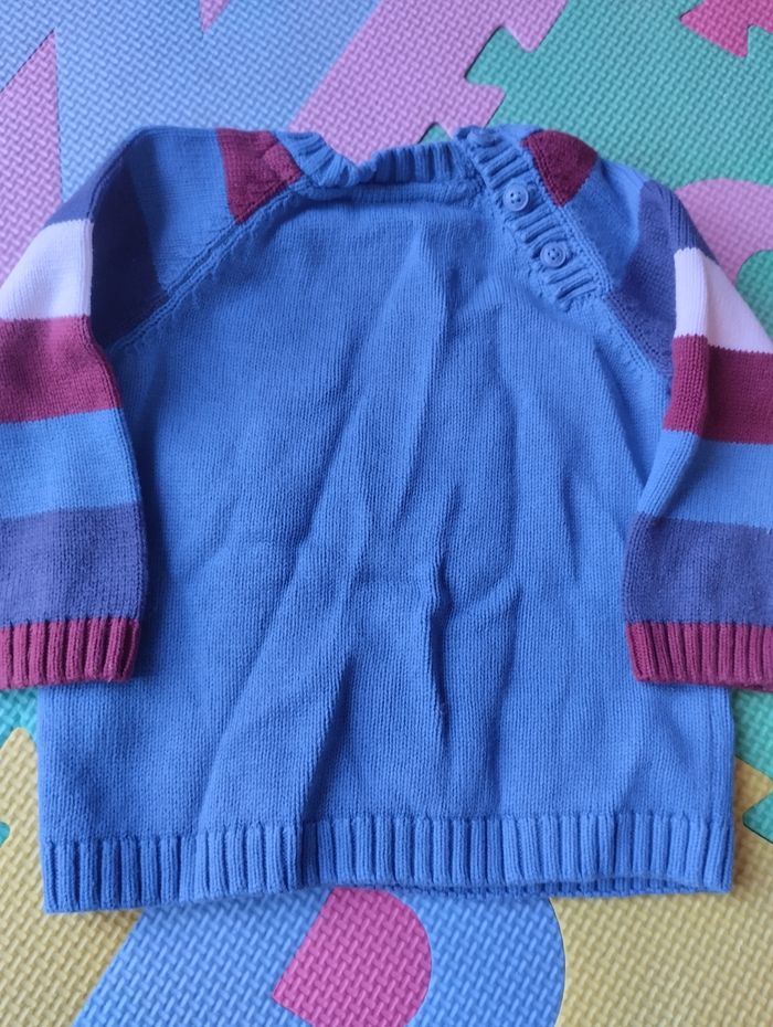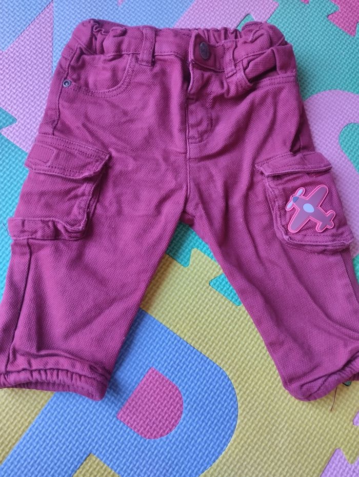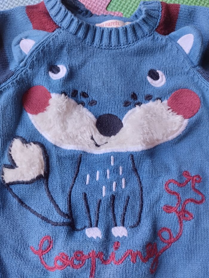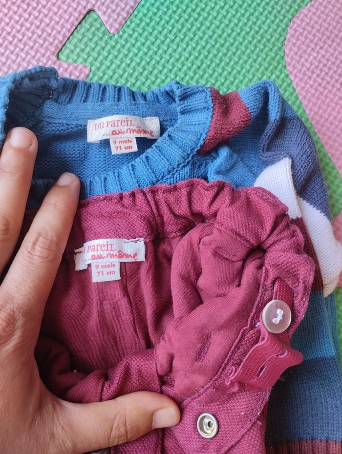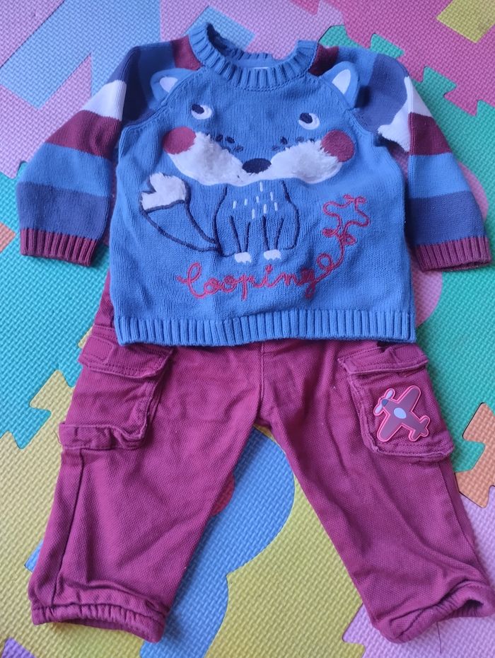 Ensemble : pull et pantalon doublé avec ceinture réglable. Taille 9 mois. Du pareil au même. Très bon état.