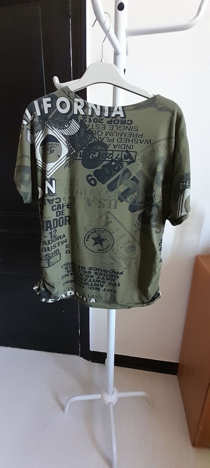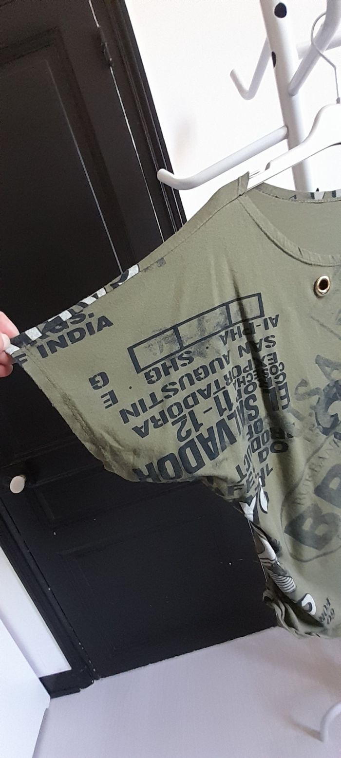 Tee-shirt taille M Couleur kaki avec Inscription Manches courtes 95% coton et 5 % Elasthane Très très bon état
