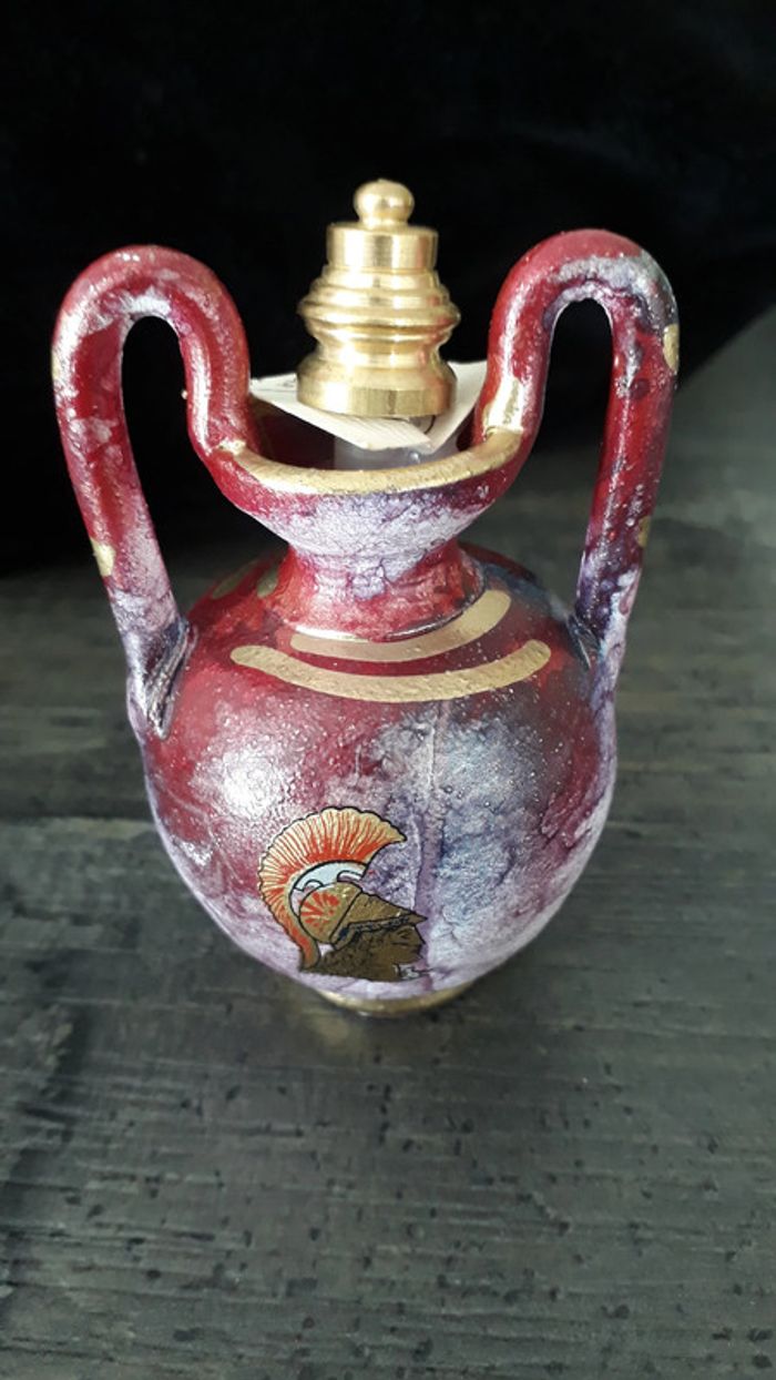 Jamais utilisé, en parfait état. Flacon en résine, peint. Hauteur 8,5 cm environ Largeur 5 cm environ.