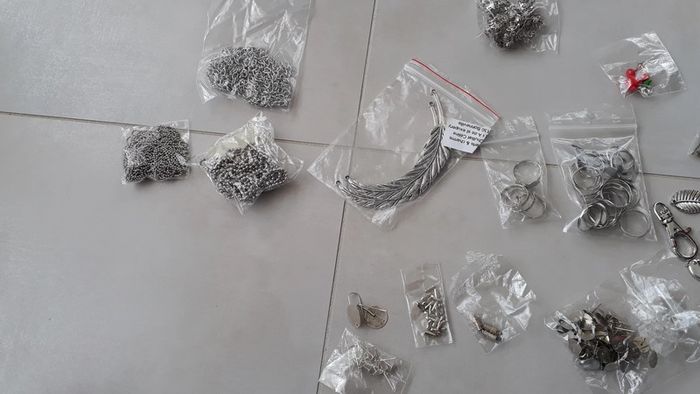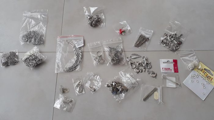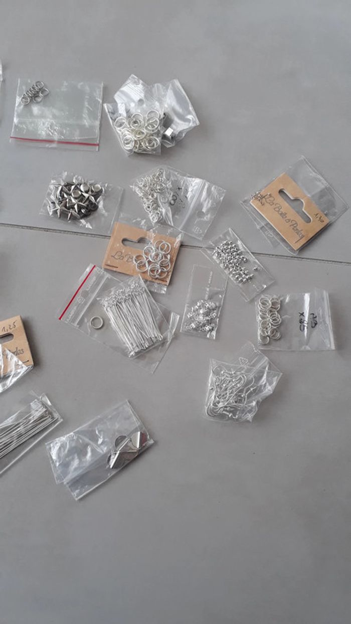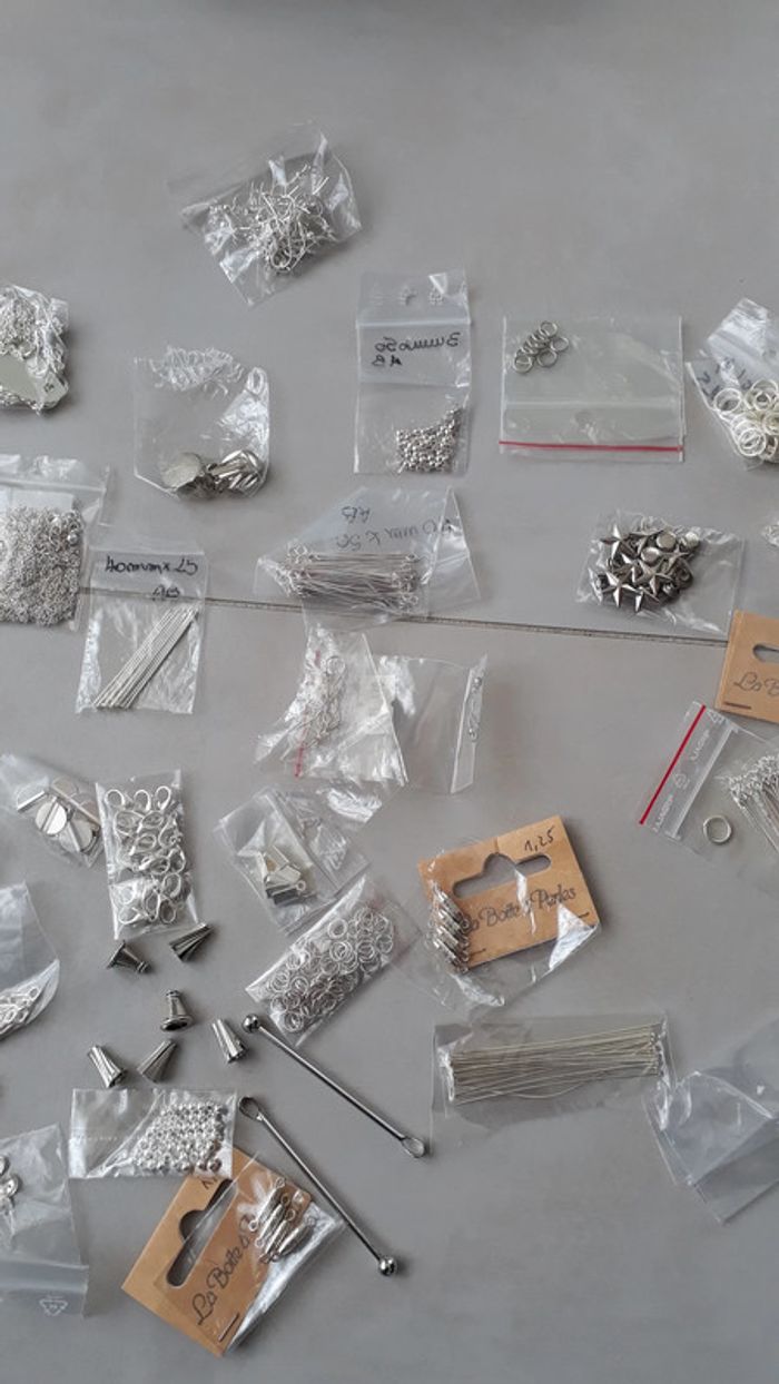Divers accessoires en métal argenté pour création de bijoux. Breloques, anneaux, fermoirs, tiges, chaînes,... Jamais utilisés, en parfait état.