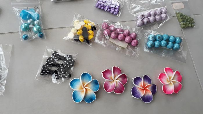 Jamais utilisées, neuves. Perles avec reflets, fleurs de tiare en Fimo percées (diamètre 4 cm), ...
